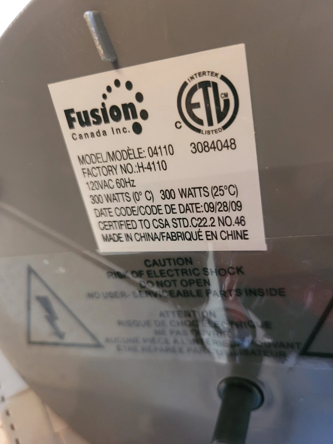 Fusion Canada portable heater, model H-4110. 120VAC, 300 Watts. Manufactured September 2009. Provides quick warmth for small spaces.