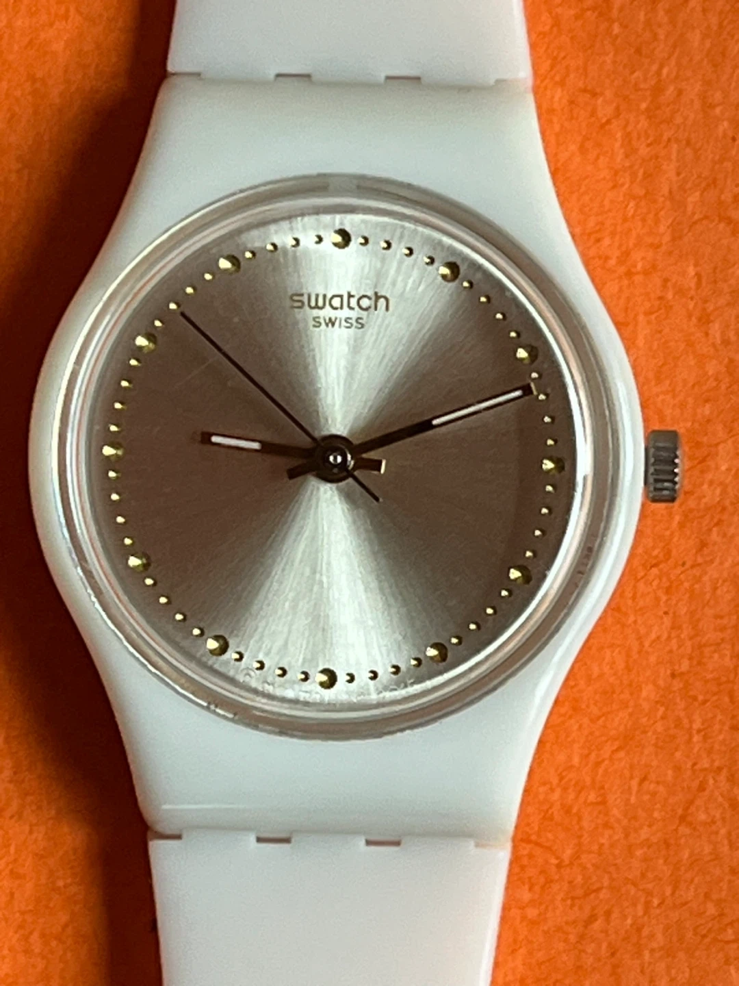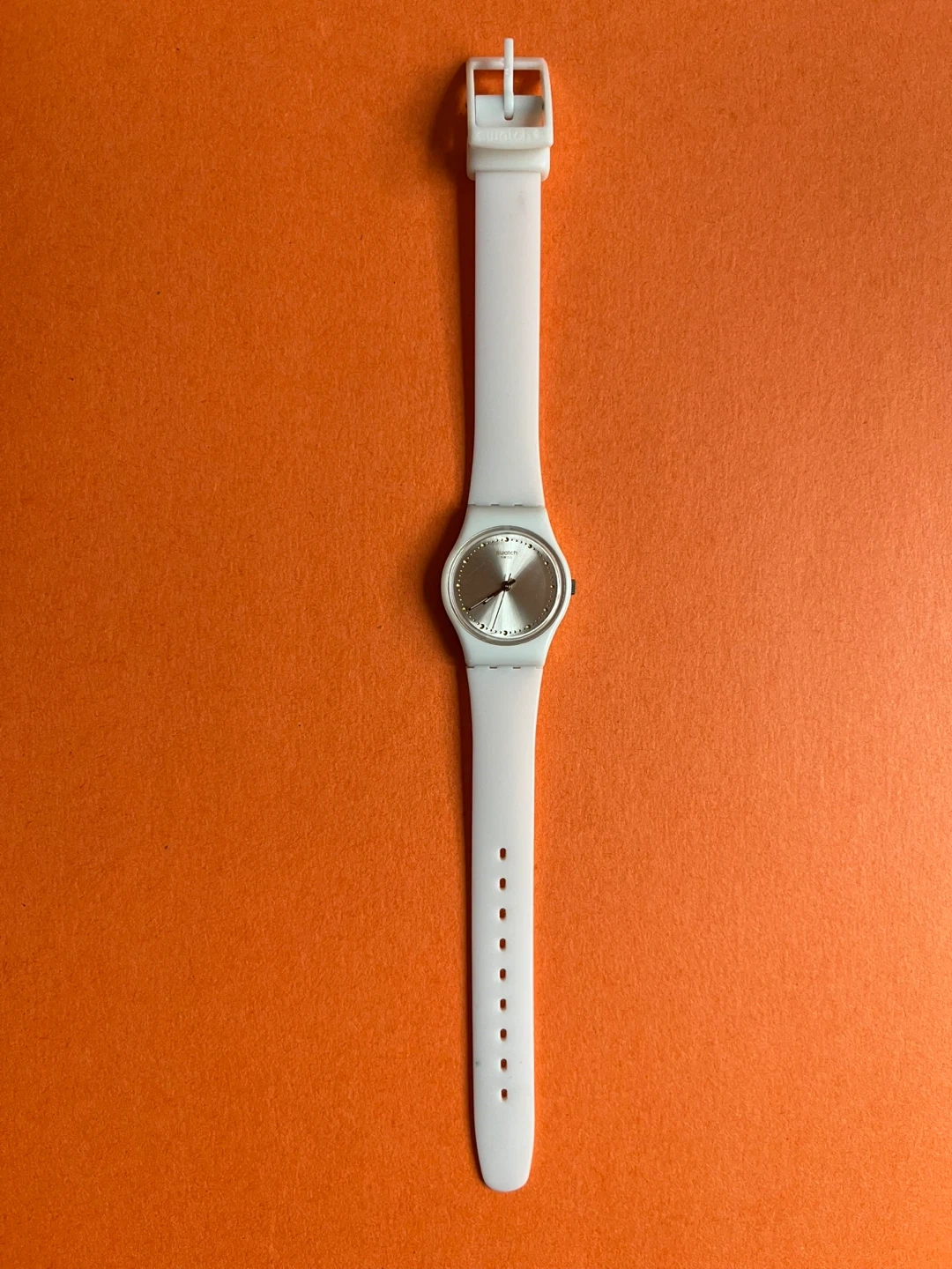 This is a Swatch watch with a white plastic band and a silver face.