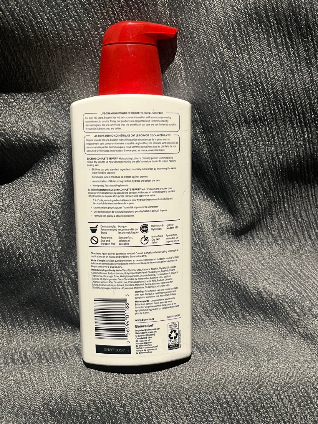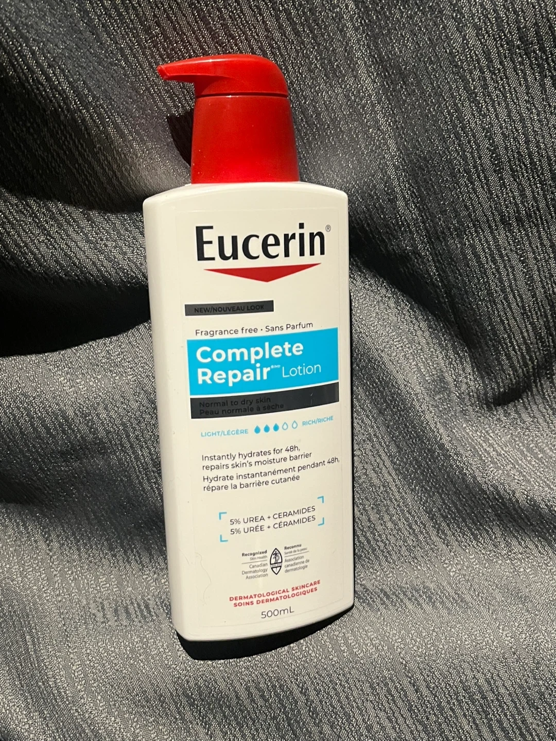 Eucerin Complete Repair Lotion for normal to dry skin. Instantly hydrates for 48h and repairs skin's moisture barrier. Contains 5% Urea + Ceramides.