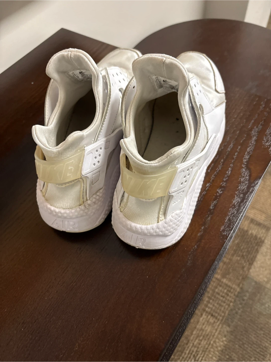 White Nike Air Huarache shoes. They feature a classic neoprene sleeve and a durable rubber sole. These are a women's size 7.