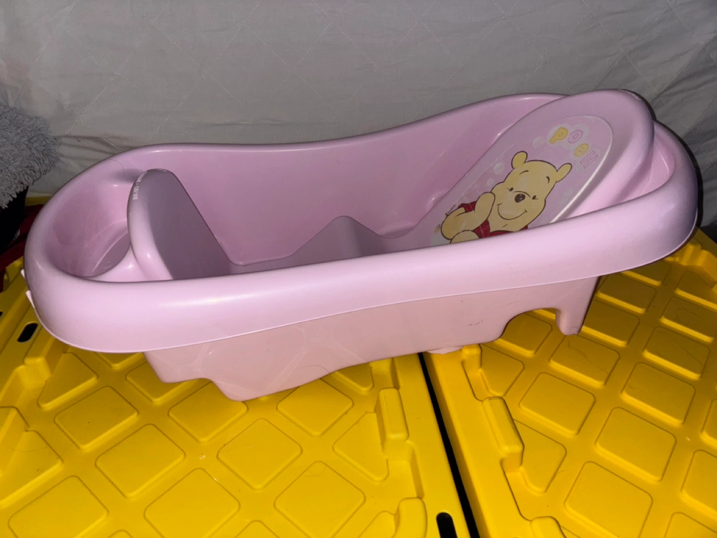 Pink baby bathtub. Winnie the Pooh design. Features a built-in seat and a headrest. Great for newborns and infants.