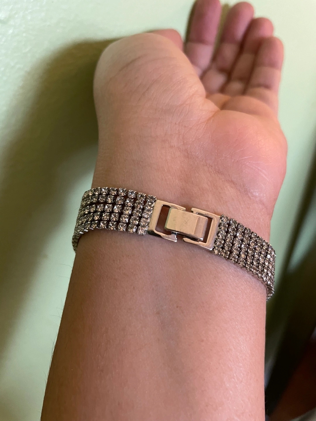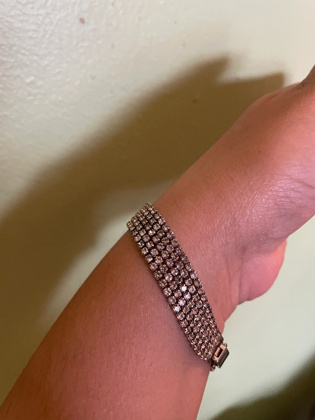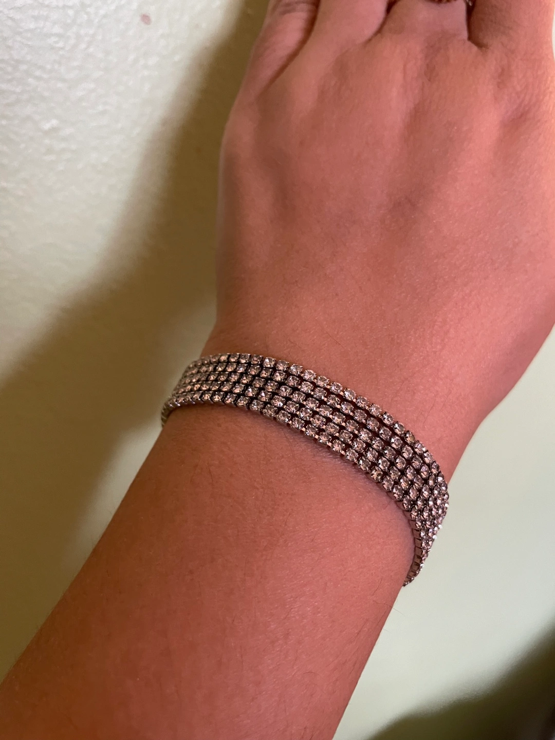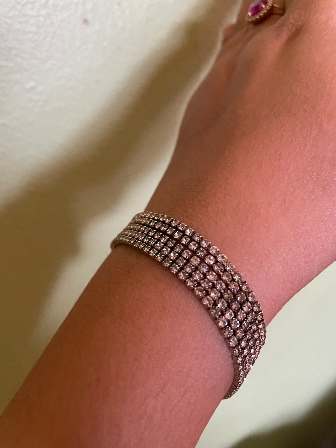 Five rows of clear crystals. Silver-toned metal clasp. Elegant and eye-catching. Perfect for adding a touch of glamour to any outfit.