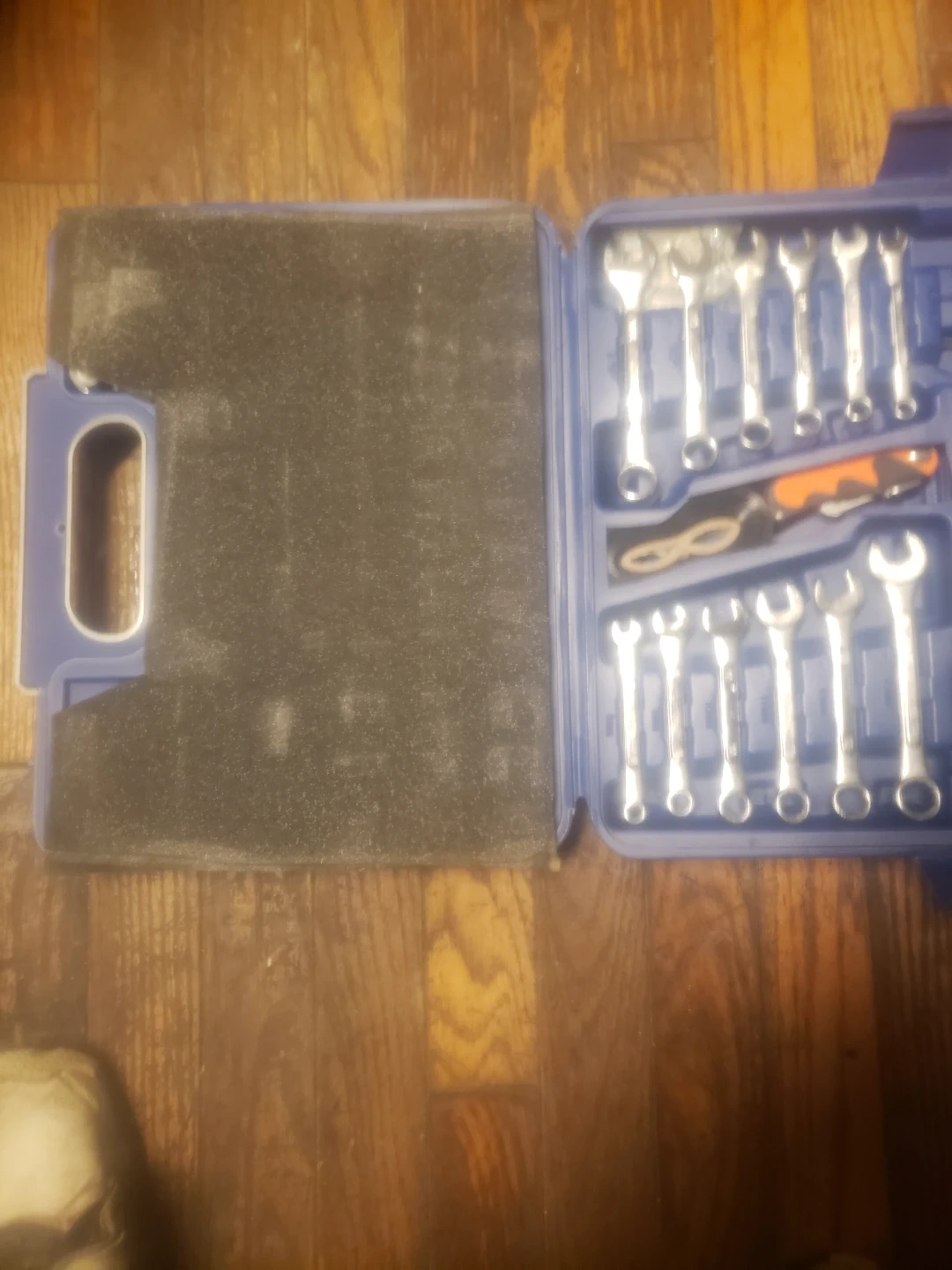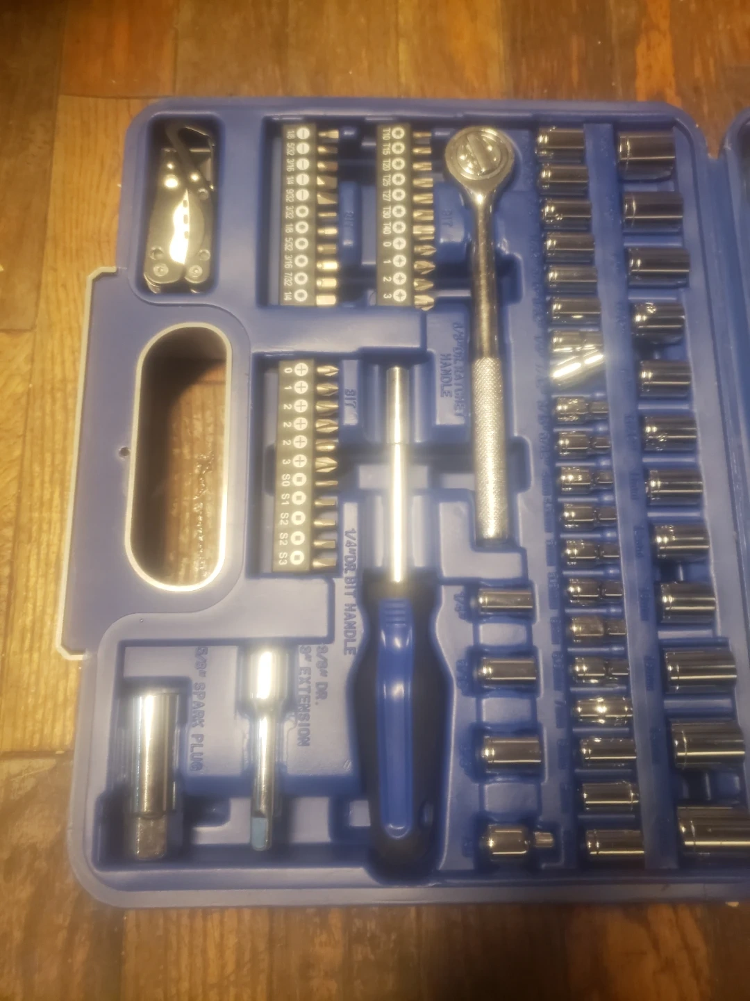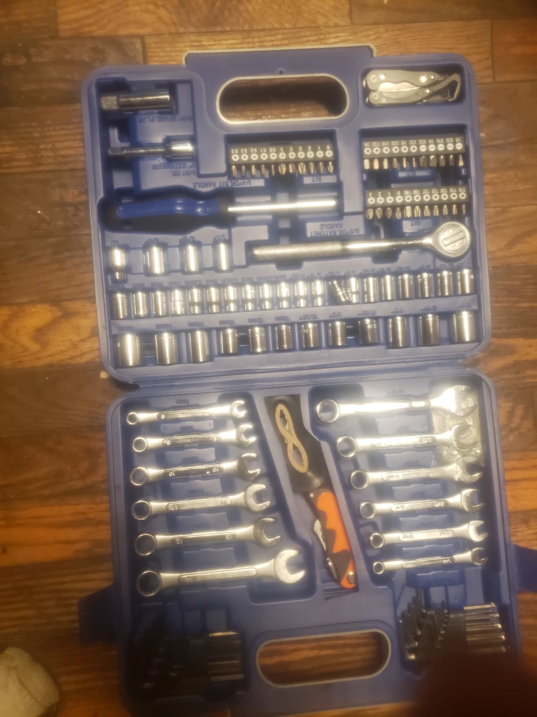 This is an Ultra-Tough 113-piece mechanics tool set. It includes a variety of sockets, wrenches, and a ratcheting screwdriver. Great for general repairs and maintenance!