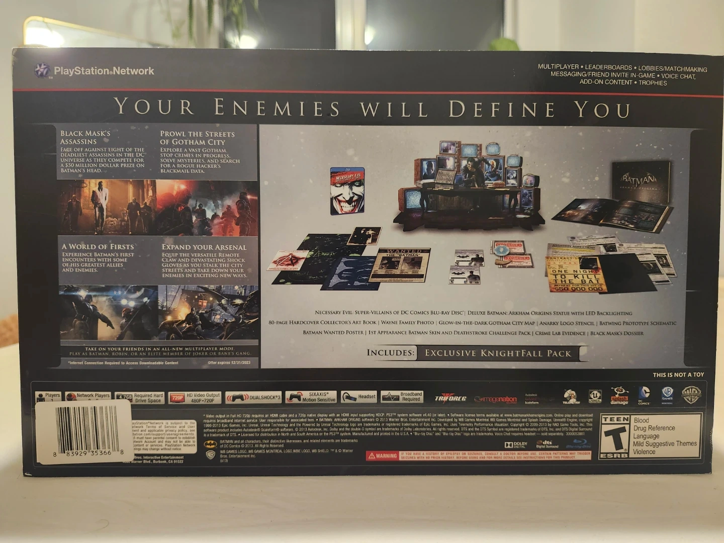 This is the Batman Arkham Origins Collector's Edition for PS3. It includes the game, a statue with LED backlighting, an art book, and exclusive physical items. Too many items to show so I took a photo of the back of the box that has all the items layed out. All items are inside the box and included. This is very rare and in almost brand new condition.