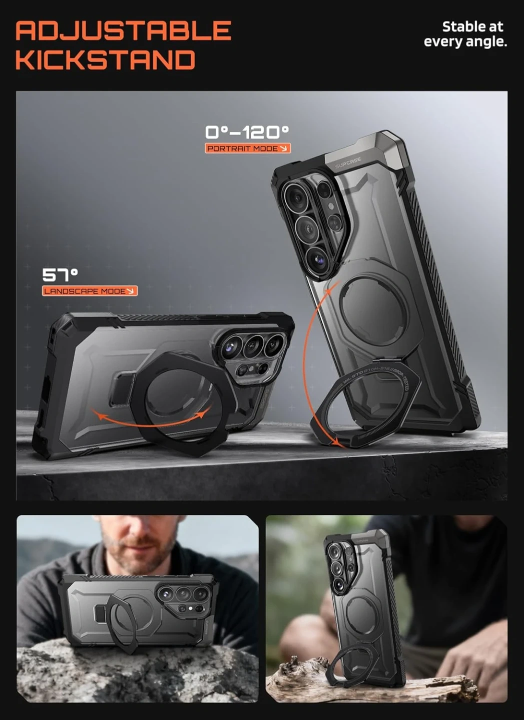 Aluminum alloy kickstand with a reinforced hinge. Portrait mode is adjustable from 0° to 120°, and landscape mode supports a 57° viewing angle. Provides stable hands-free support, perfect for everyday use such as watching videos, video calls, and live streaming.