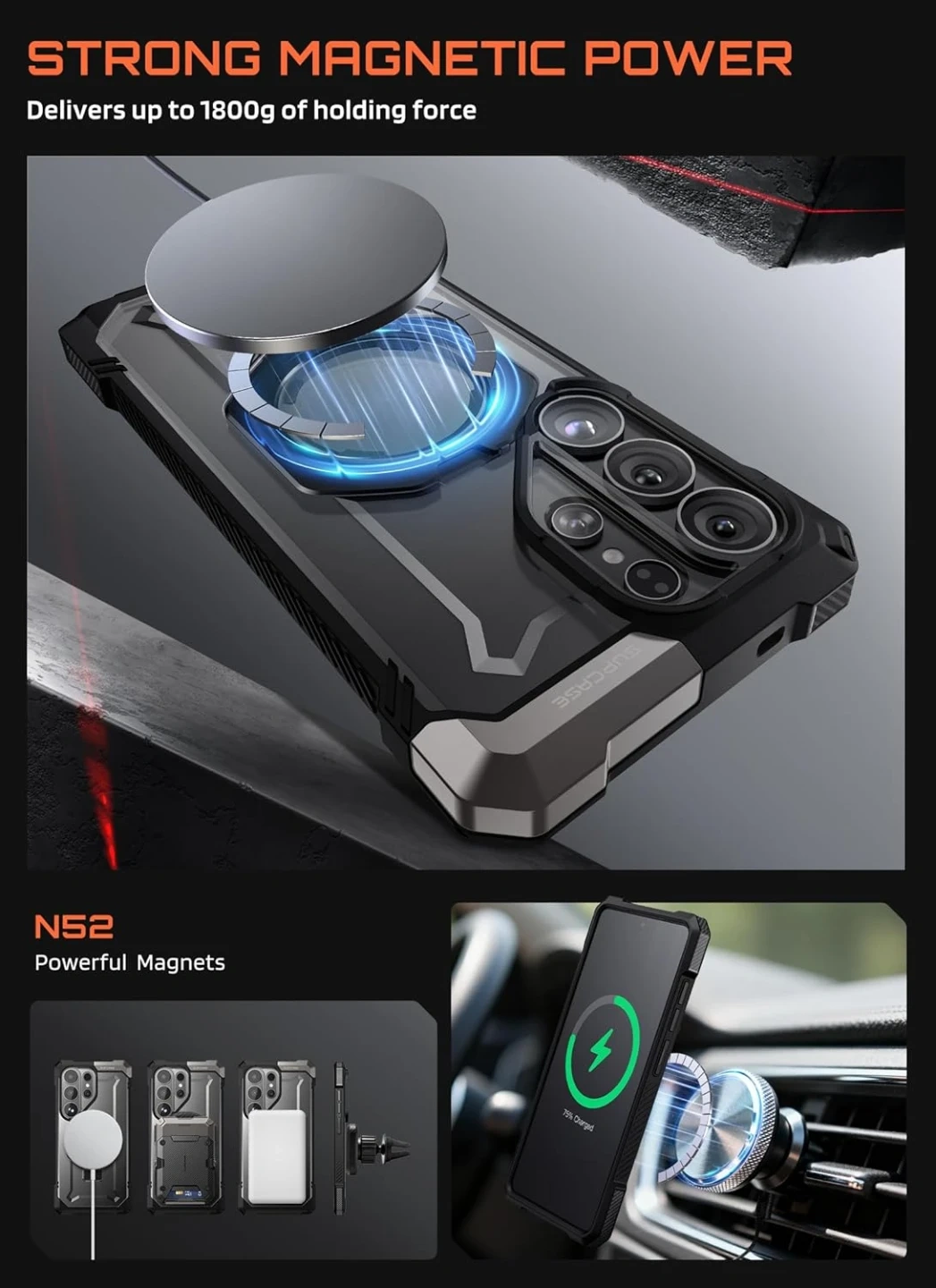 Features precise magnetic alignment for stable wireless charging. Equipped with built-in N52-grade magnets delivering up to 1800 g of magnetic force. The backplate thickness is approximately 1.64 mm, allowing compatibility with MagSafe accessories such as magnetic car mounts, MagSafe wireless chargers, magnetic card holders, and desktop magnetic wireless charging stands.