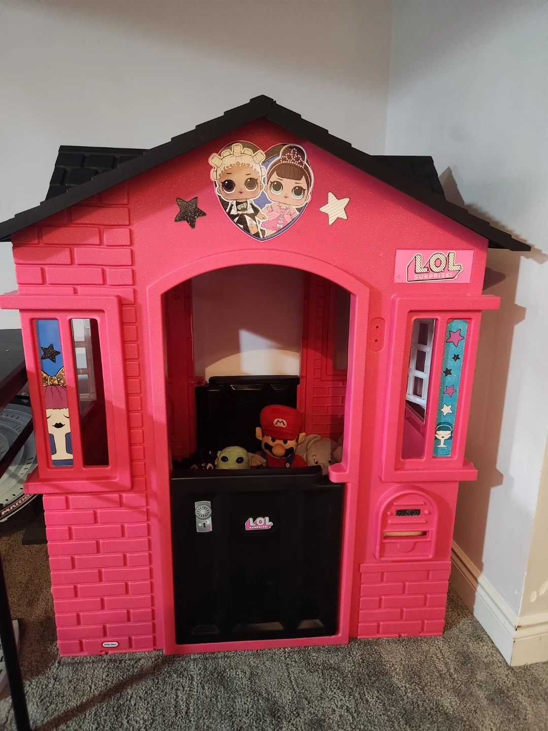 This is a bright pink LOL Surprise playhouse designed for indoor or outdoor fun. It was only used indoor never placed outside, therefore in good condition.
