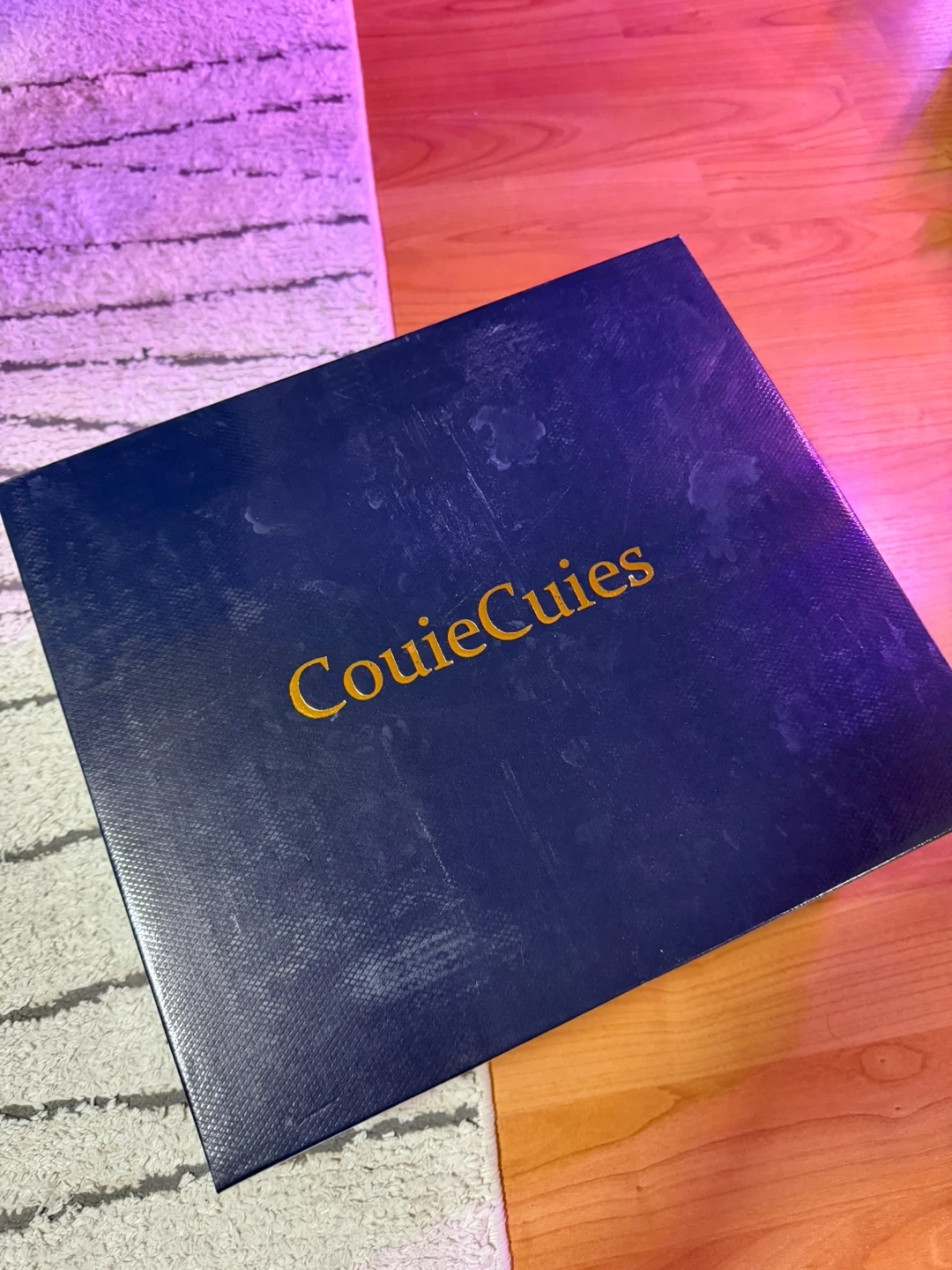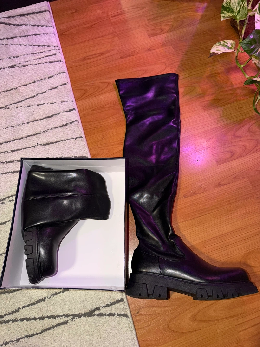 CouieCuies women's over-the-knee boots in black. They're size 11 and feature a chunky lug sole. Material appears to be faux leather. Includes original box. Very comfortable! Worn once for a costume.