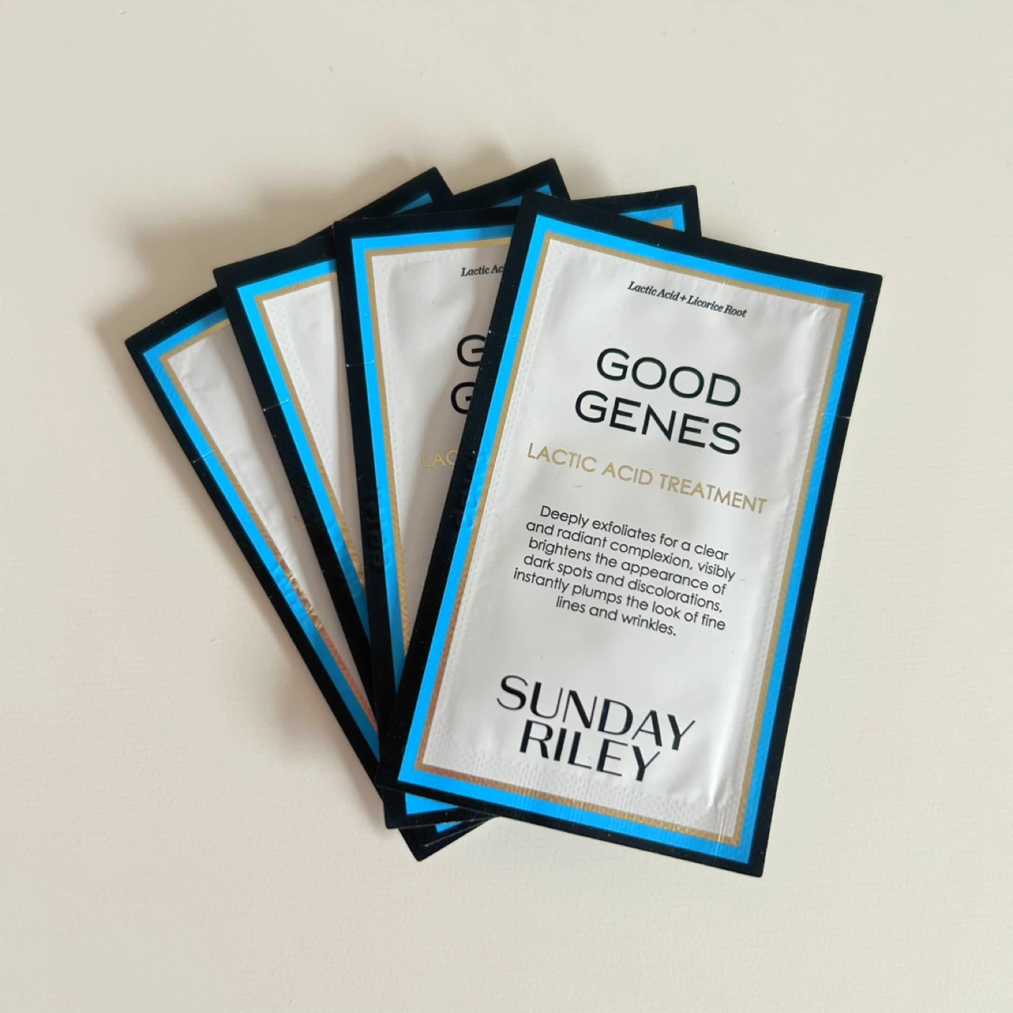 Four packets of Sunday Riley Good Genes Lactic Acid Treatment. Each packet contains 1ml of product. It deeply exfoliates for a clear and radiant complexion, visibly brightens dark spots and discolourations, and instantly plumps the look of fine lines and wrinkles. Apply morning and night as needed. Made in the USA. Lactic Acid + Licorice Root.