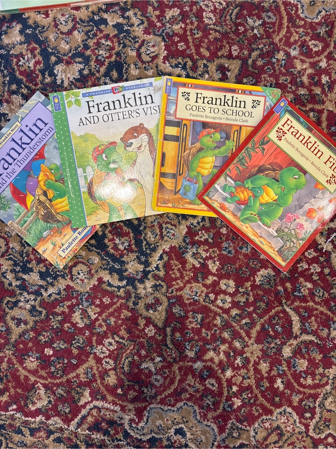 Collection of four Franklin storybooks. Titles include "Franklin and the Thunderstorm", "Franklin and Otter's Visit", "Franklin Goes to School", and "Franklin Finds a Way". These are fun reads for young children. Great for bedtime stories!