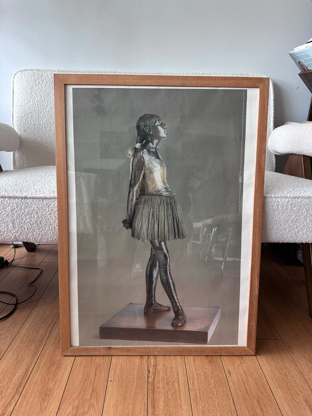 A framed print depicting Degas' iconic "Little Dancer" sculpture. This piece showcases the detail of the original artwork. It's presented in a simple wooden frame, ready to hang. A beautiful addition for any art enthusiast's home.