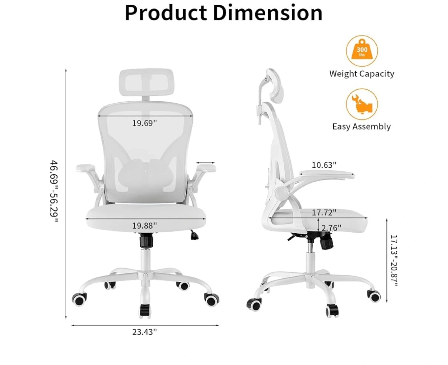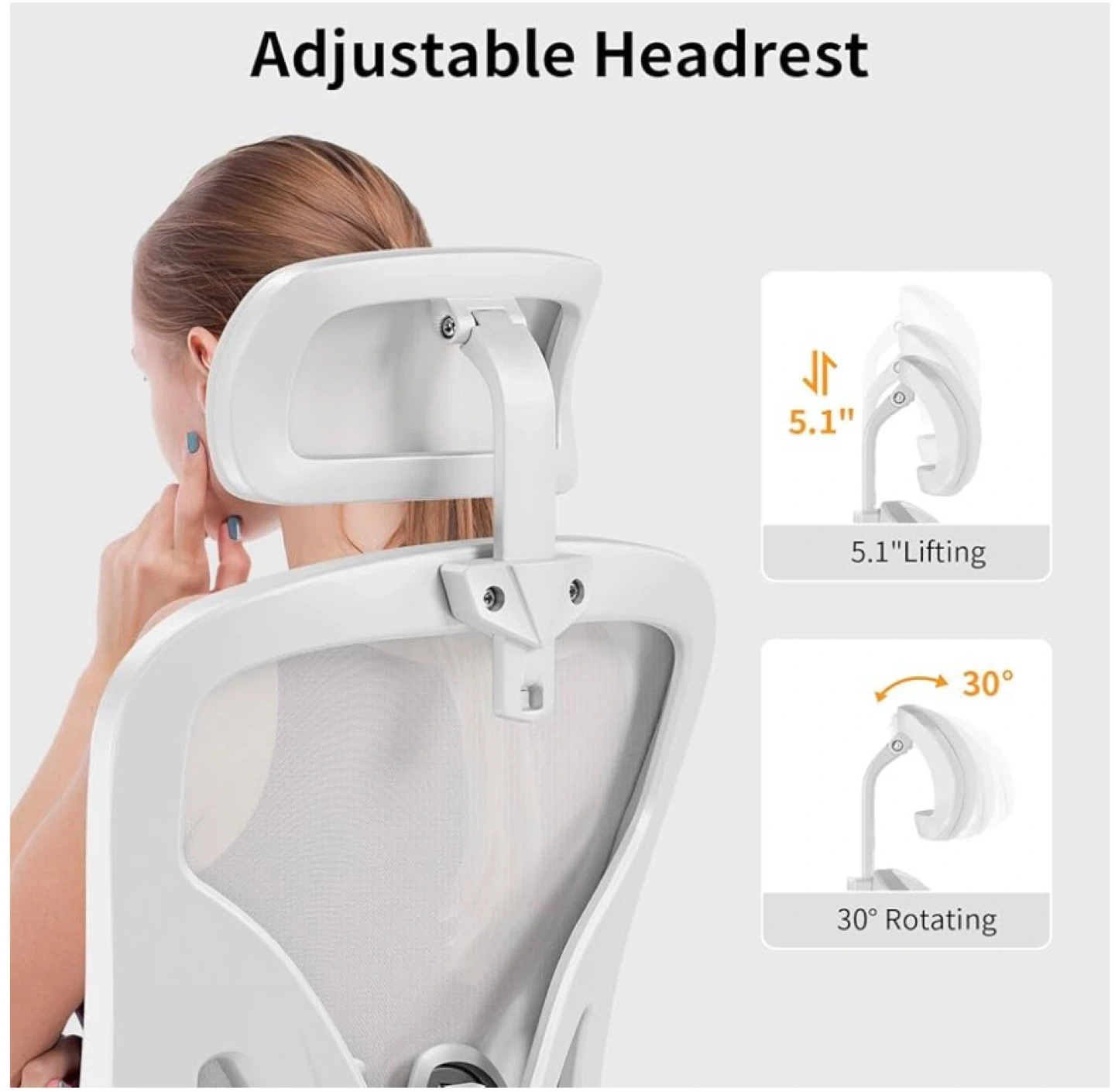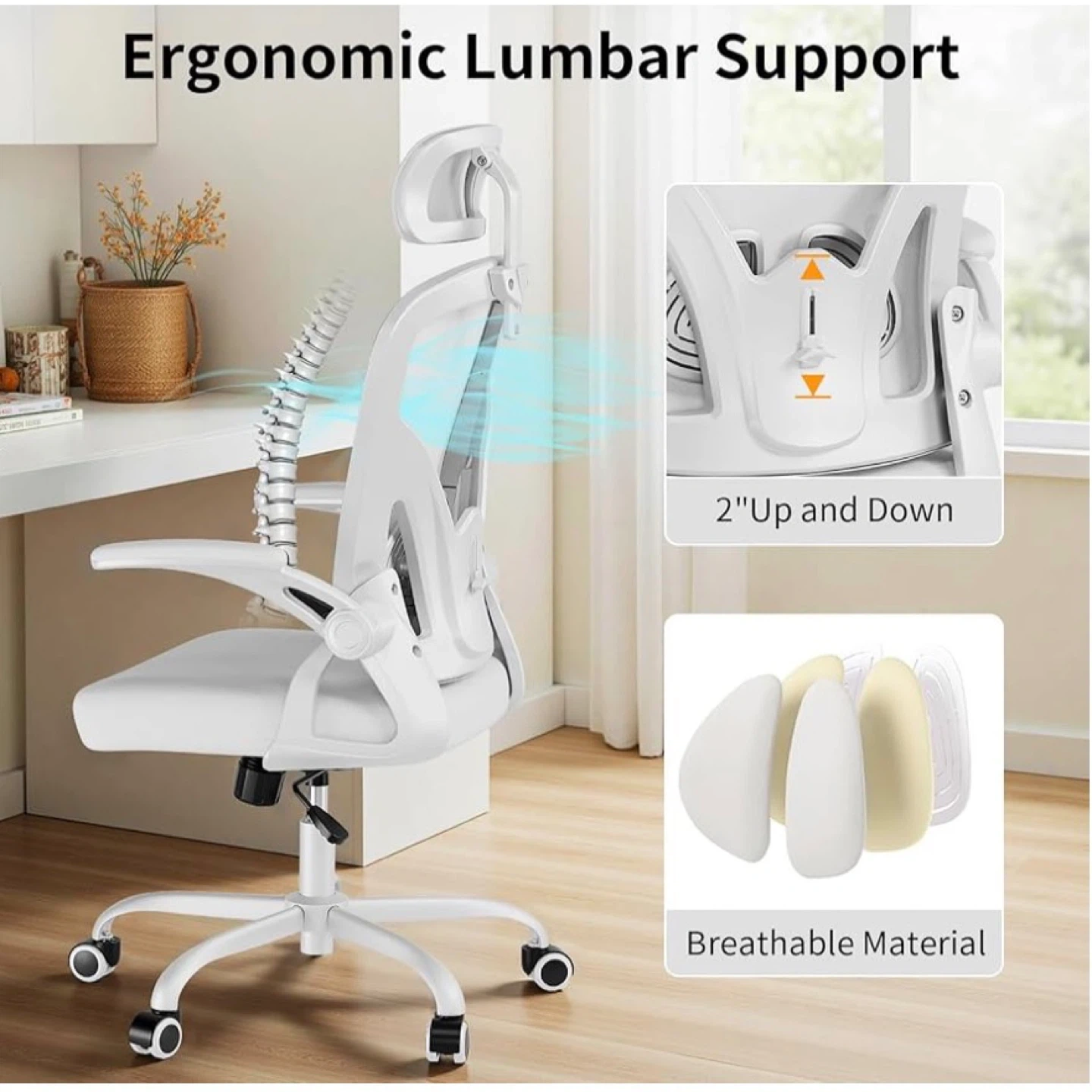 This office chair features adjustable lumbar support and a breathable mesh back. It has an adjustable headrest with 5.1" lifting and 30° rotating capabilities. Easy assembly required.