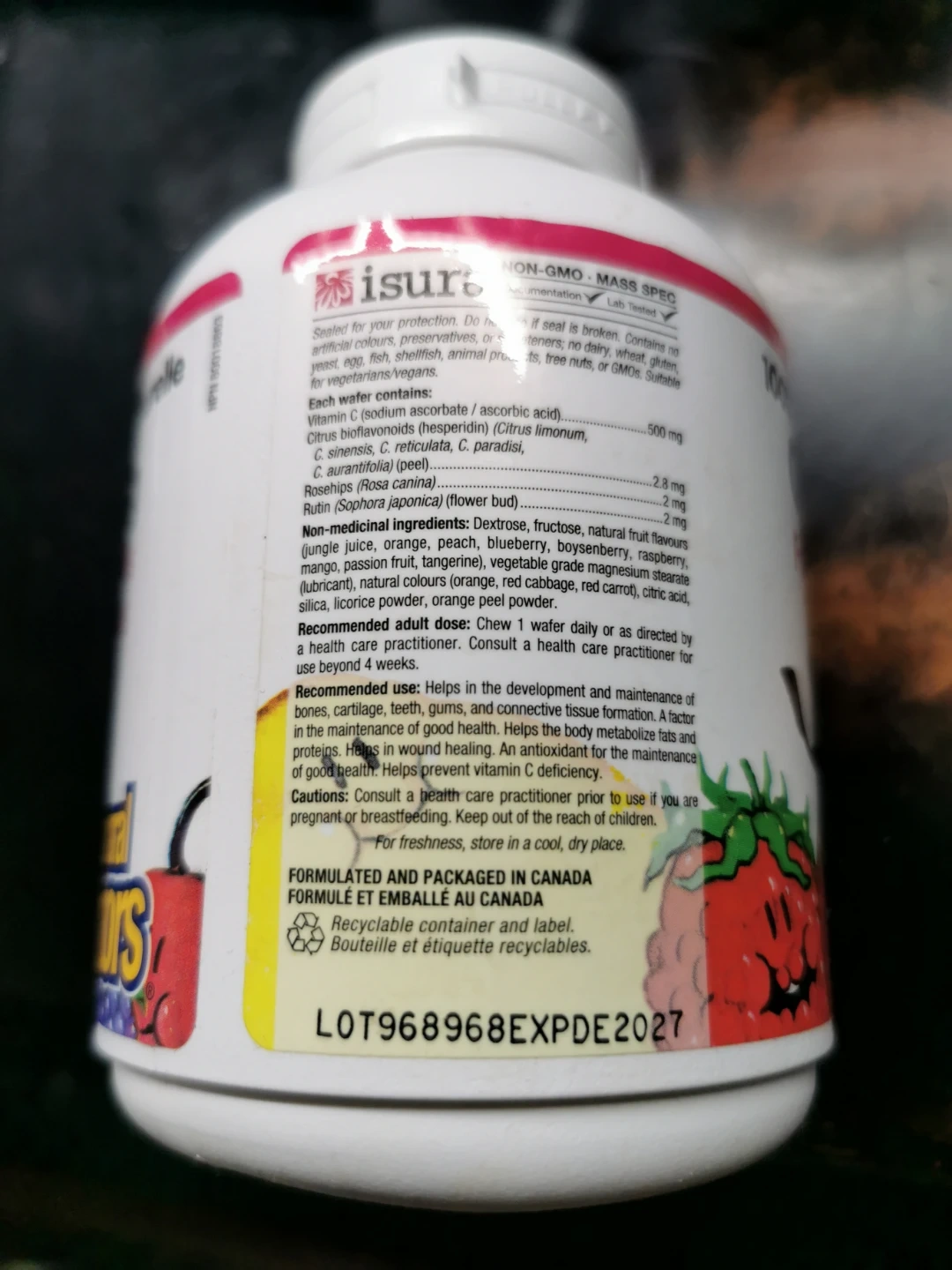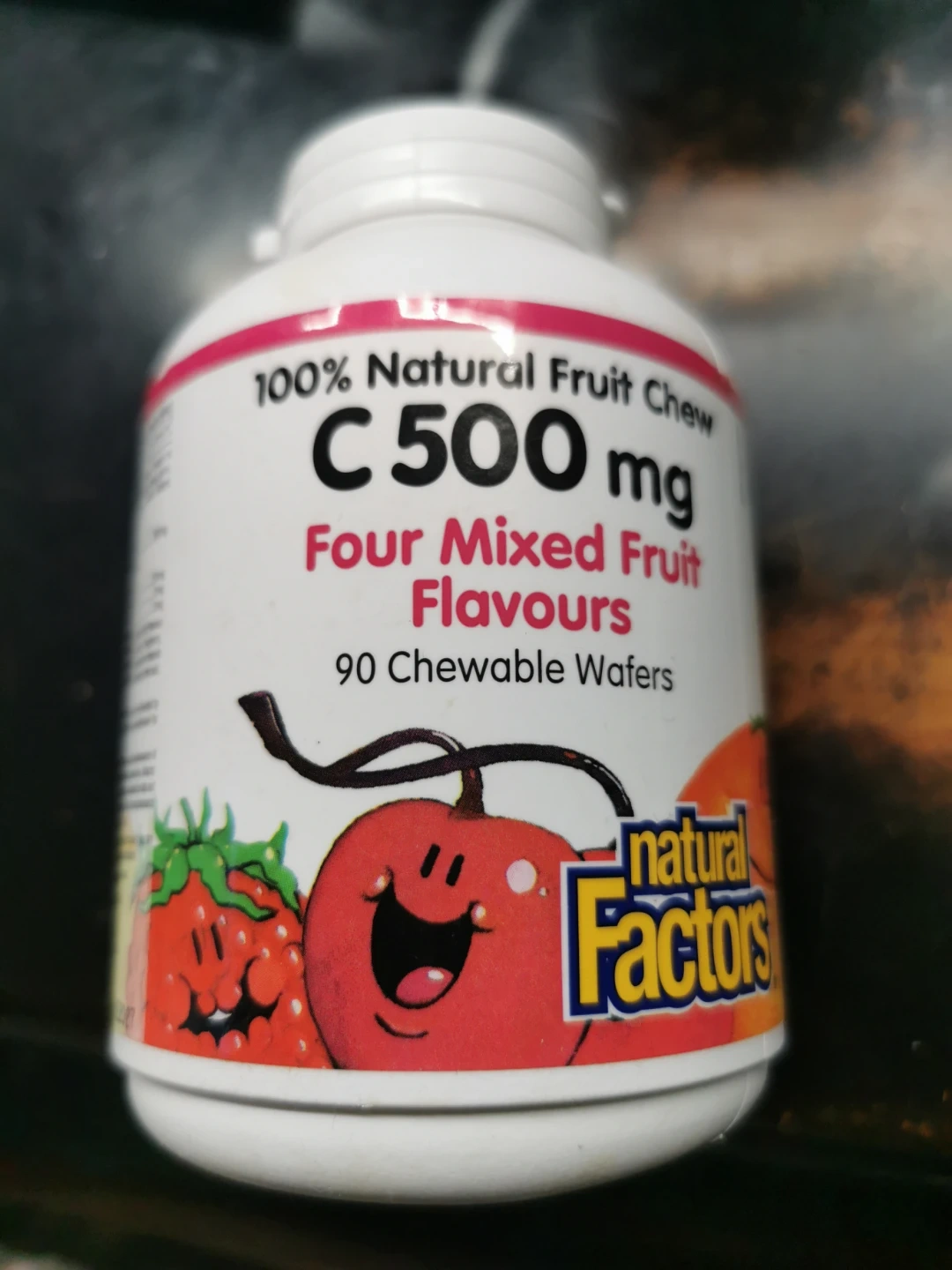 Natural Factors C 500 mg chewable wafers come in four mixed fruit flavours. Each wafer contains 500 mg of Vitamin C (ascorbic acid) and other fruit bioflavonoids. Formulated and packaged in Canada.