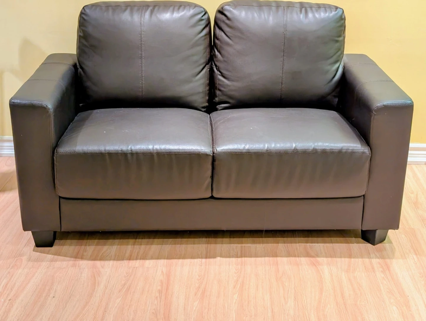 Chocolate brown faux leather loveseat sofa. It's a two-seater with plush cushions. Offers comfortable seating for small spaces.