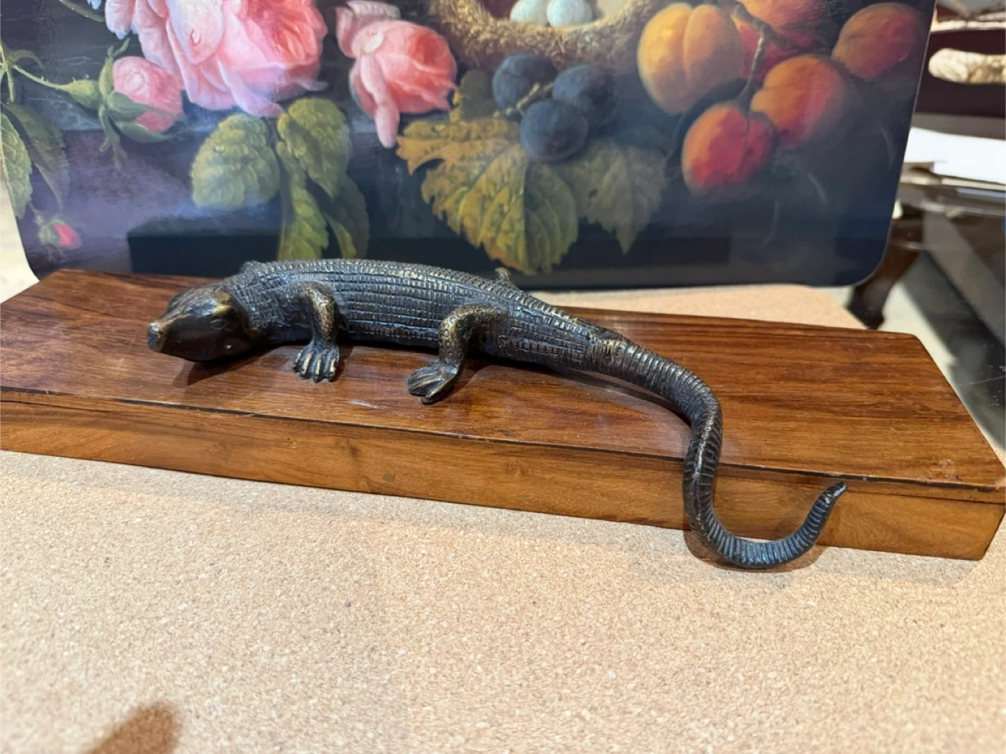 Vintage Walnut Wooden Lid only with Bronze Lizard Sculpture