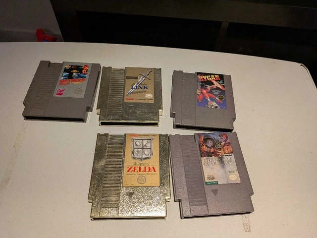 Selling 5 NES games as a lot. Sorry, just selling as a lot, not separate! They don't have manual, box, or the black covers. The games are: Legend of Zelda, Legend of Zelda 2, Rygar, Metroid, Battle of Olympus. Can meet in the Thornhill area.