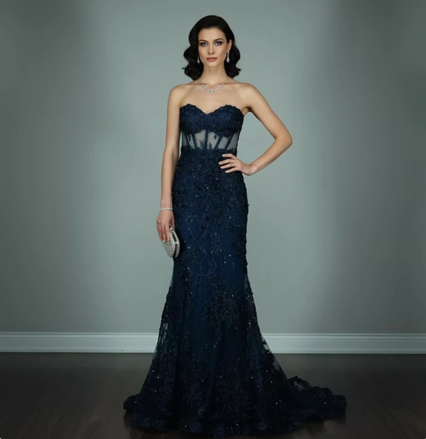 Stunning navy blue strapless gown with intricate lace and sequin embellishments. It features a sheer corset bodice and a mermaid-style skirt. This dress is perfect for formal events and galas!