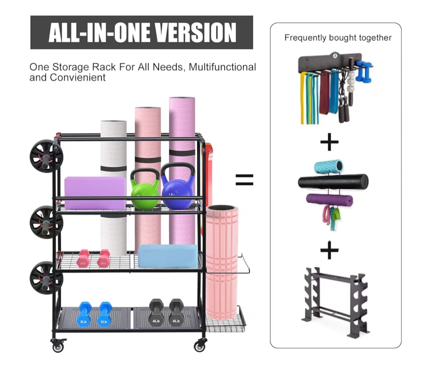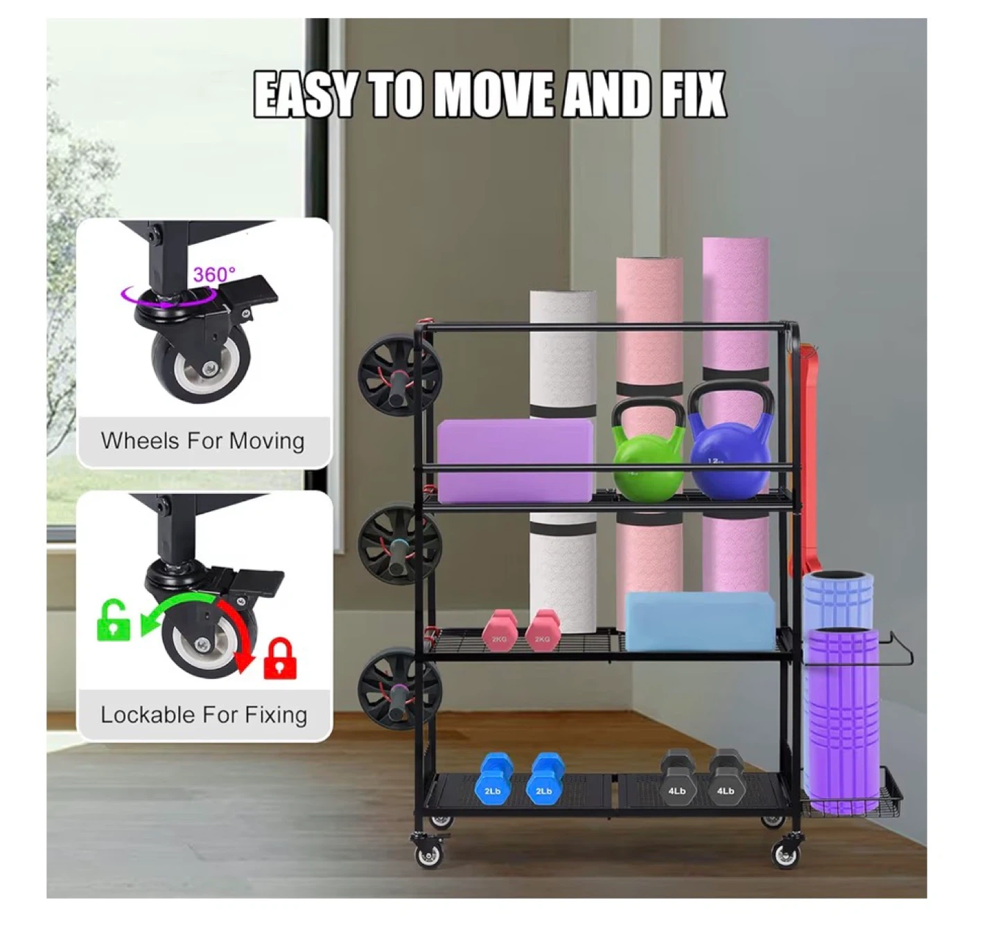 This all-in-one storage rack organizes your workout equipment. It features multiple shelves and hooks, plus wheels for easy movement and locking for stability. It's great for home gyms or fitness studios!
