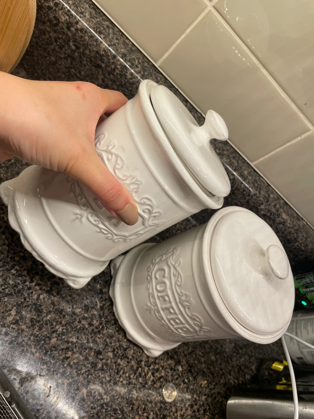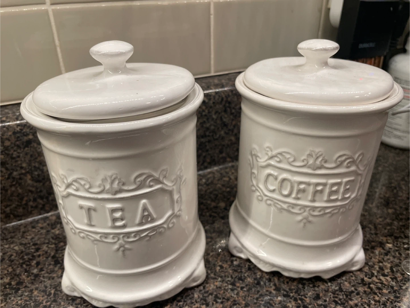 447Selling a set of lovely white ceramic canisters, perfect for storing your tea and coffee! One is labeled 'Tea' and the other 'Coffee', so you'll never mix them up. They're in great condition and would look so cute on your kitchen counter