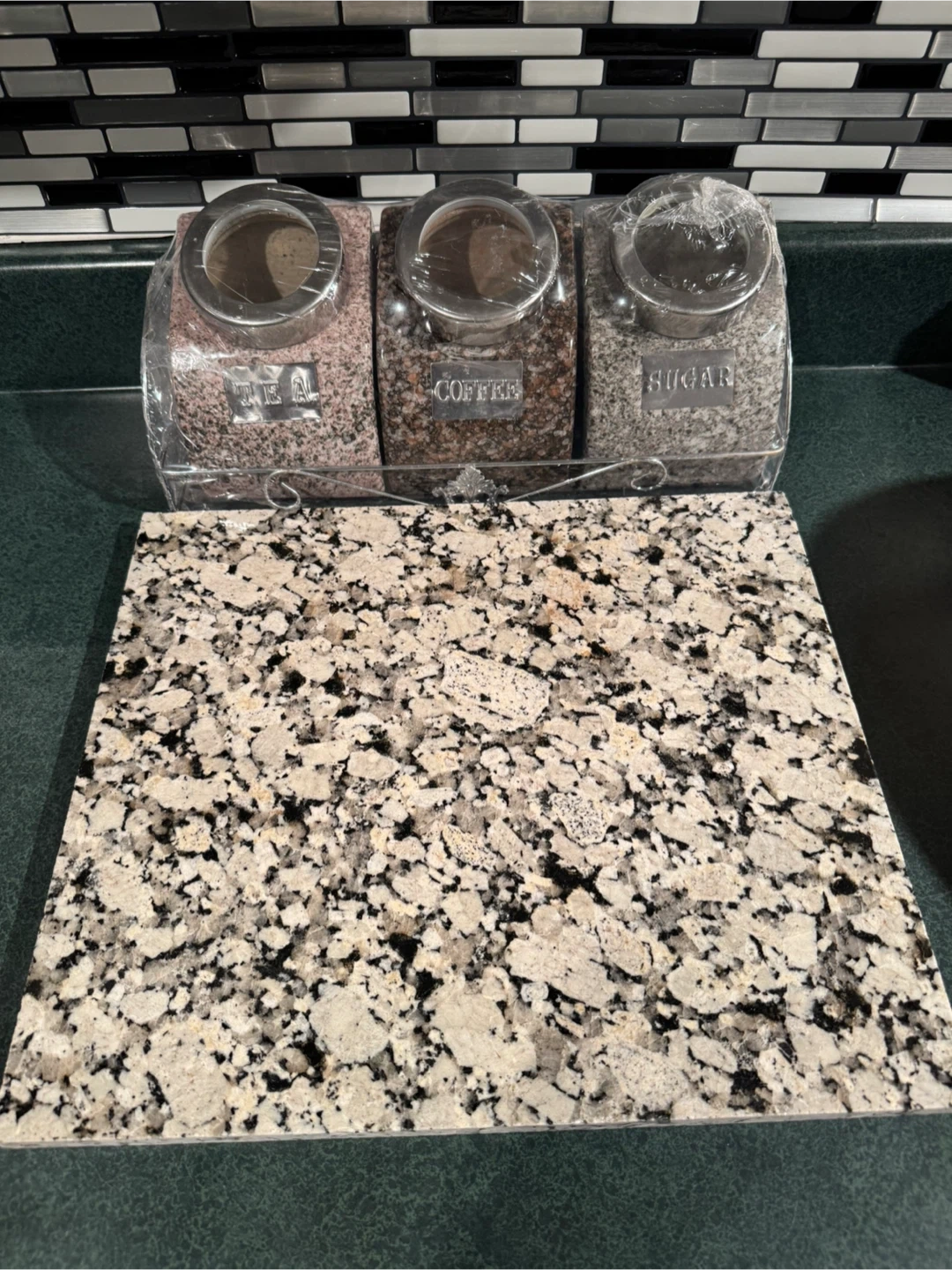 Set of three ceramic canisters labelled Tea, Coffee, and Sugar. They come with a granite board 12-14 inch that would look great in any kitchen