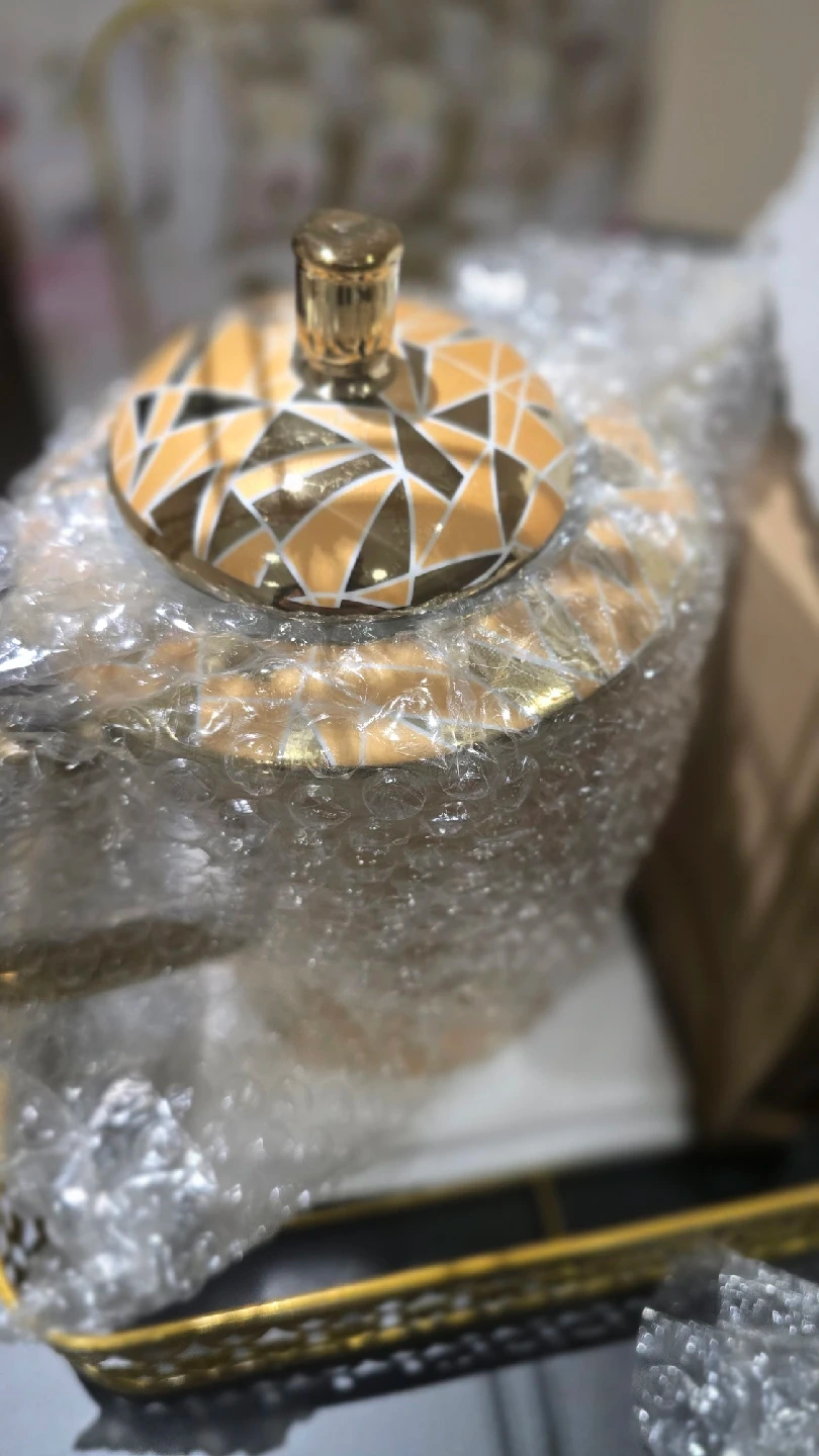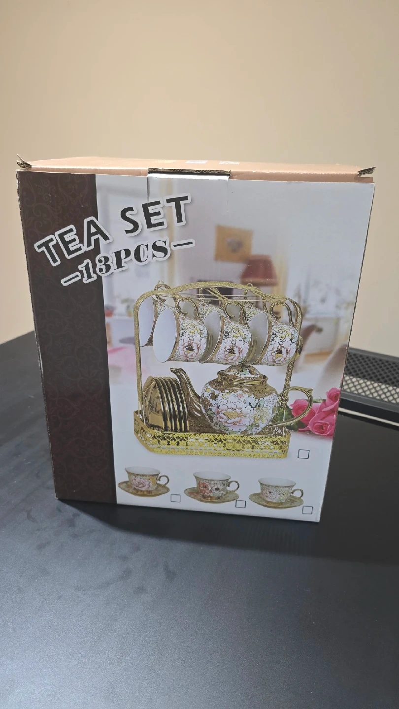 18Selling a brand new tea set that includes 18 pieces! It comes with a teapot, cups, saucers, and a display stand. The set is gold in color with floral designs. The set is still in its original box!