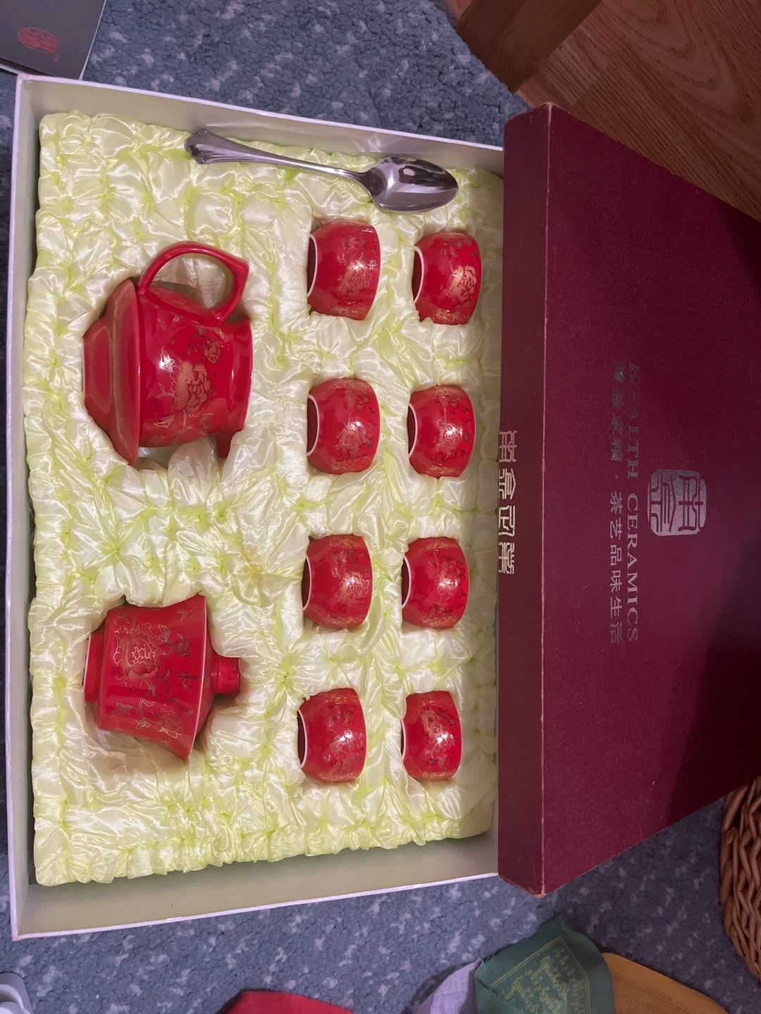 Selling a beautiful Health Ceramics Ru Ware tea set. This set comes in its original box and includes a teapot, several cups, and a spoon. The set features a lovely red and gold design, perfect for tea enthusiasts.