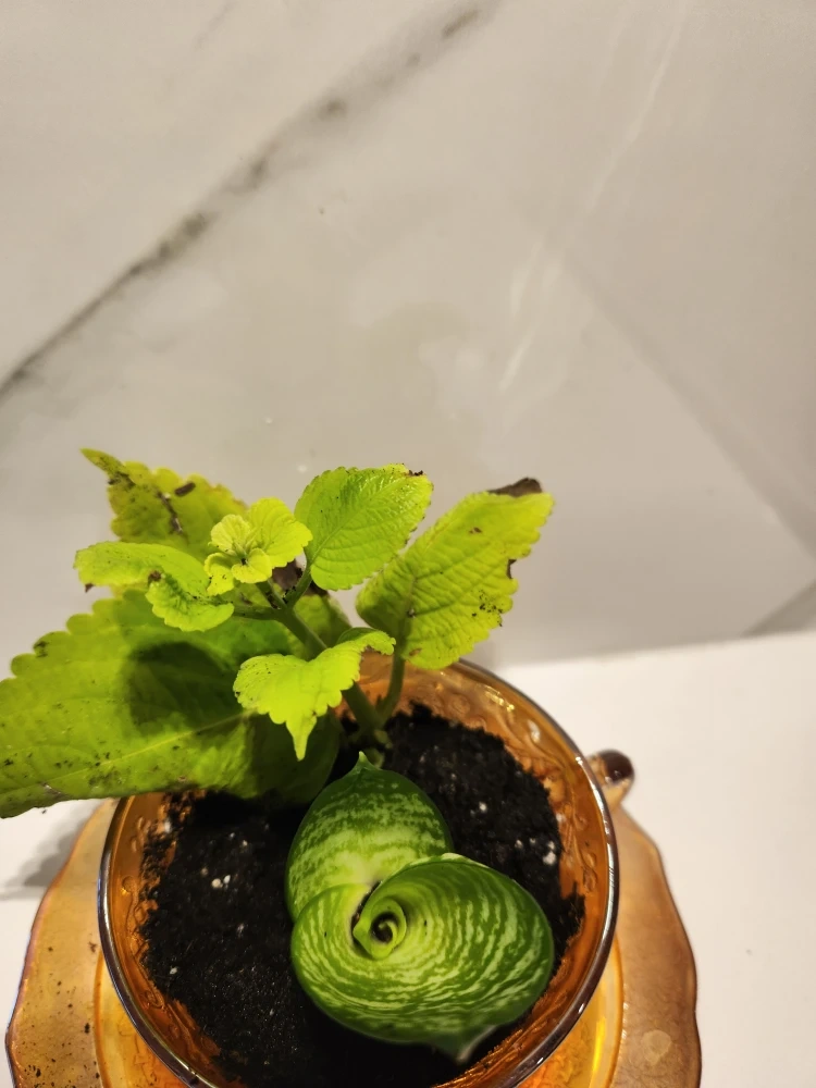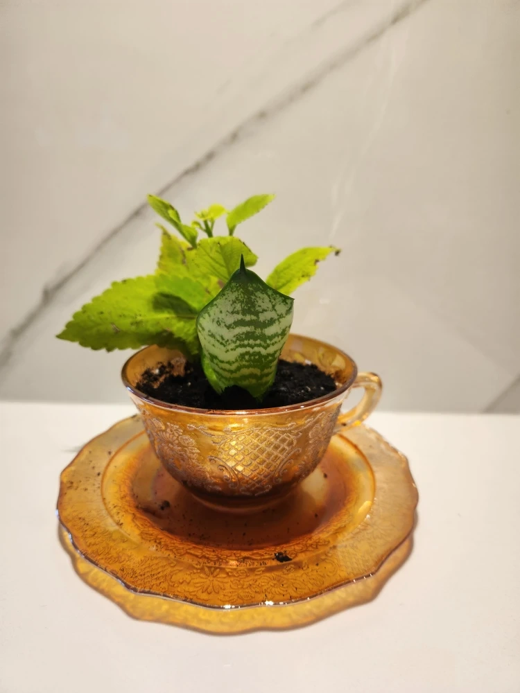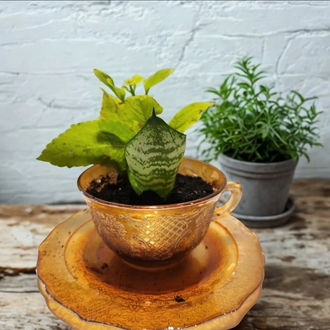 32Cute little teacup planter with a small plant! It's a unique and charming addition to any space. The amber-coloured cup and saucer add a touch of vintage elegance to your home or office.