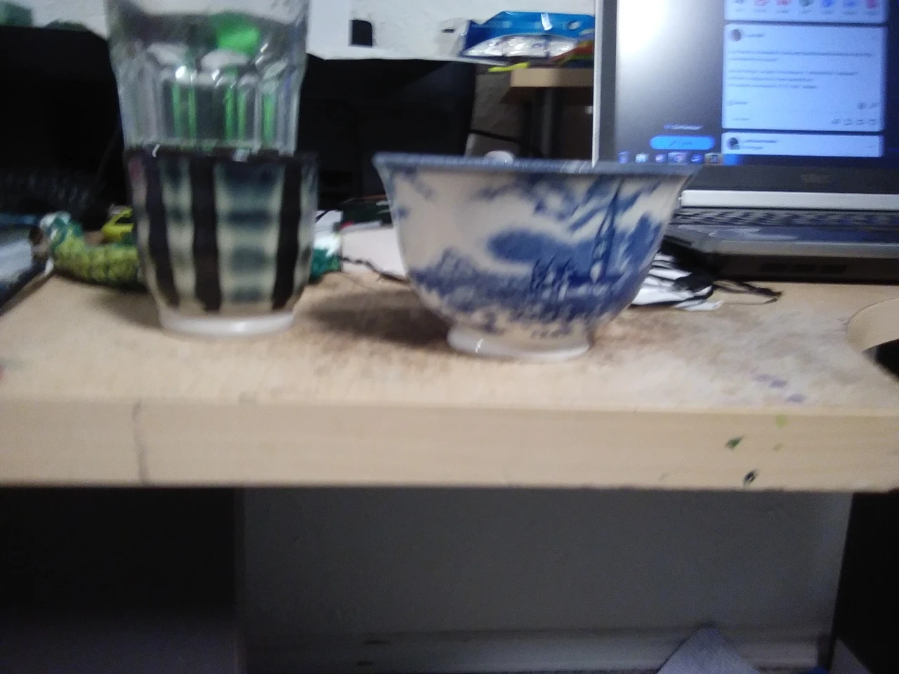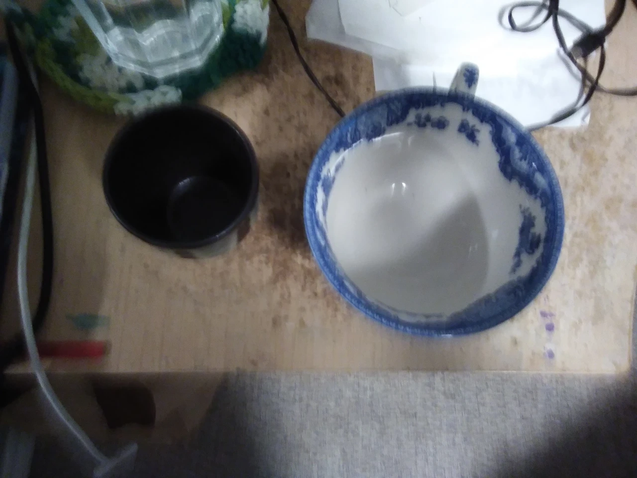 some blue tea cups. the white one was bought at a thrift store but clean and the smaller one is brand new never used.