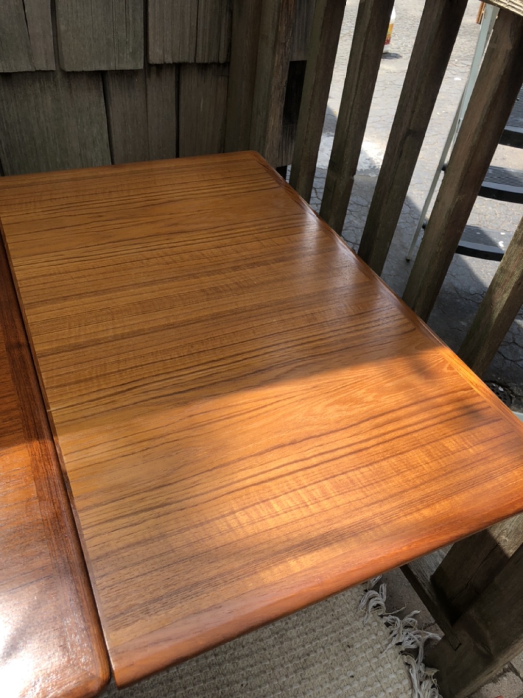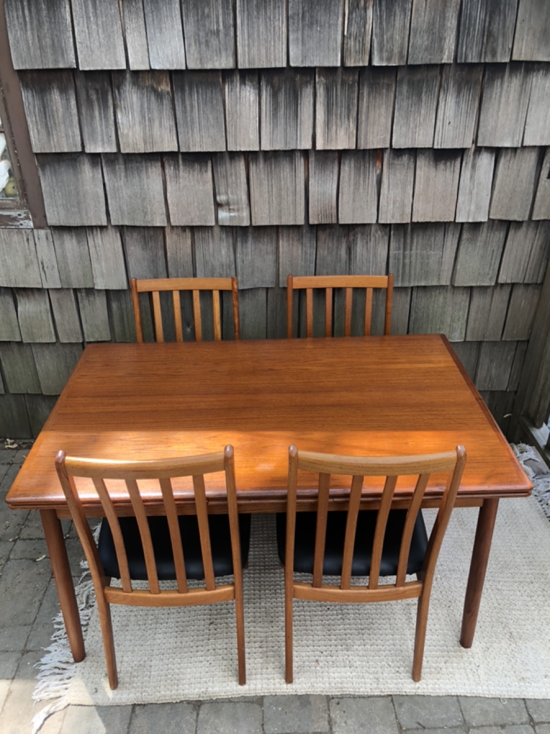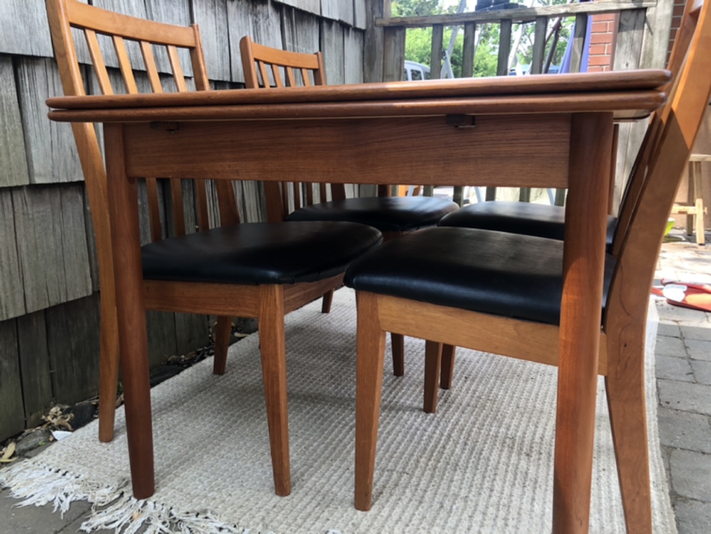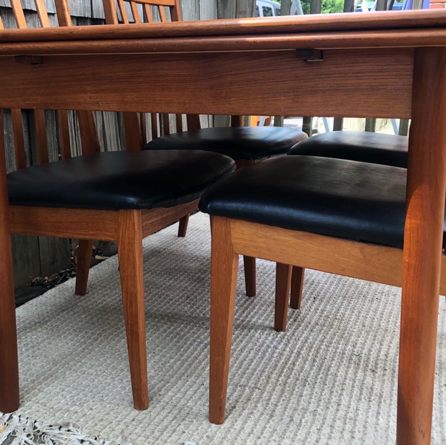 Teak Dining set $900 (if both parts bought together) Chairs $400 (for set of 4) -average vintage wear -black vinyl chairs -Nordic furniture -good size and sturdy Table $550 - 55” L+ (2 leaves) 21” + 21” 29” H 35.25” W -legs were refinished by us (like new) -the top has been refinished by previous owner with a stain similar to original colour and polyurethane (poly does not have a perfect application) however because a poly finish is stronger than teak oil this table will be able to live durably for a long time (great with kids) - the top could easily be refinished In a couple of years to get rid of the poly finish -some spots where finish was sanded due to uneven application -the top of this table has one small dent but it’d highly unnoticeable - great vintage condition -super sturdy and solid -one leaf sits a little higher than the other but it could just be something needing adjustment *set can be split apart Viewings are welcome, fastest pickup This table dissassembles easily into 4 legs, 2 separate leaves, base and top Follow us @teakhunters on Ig