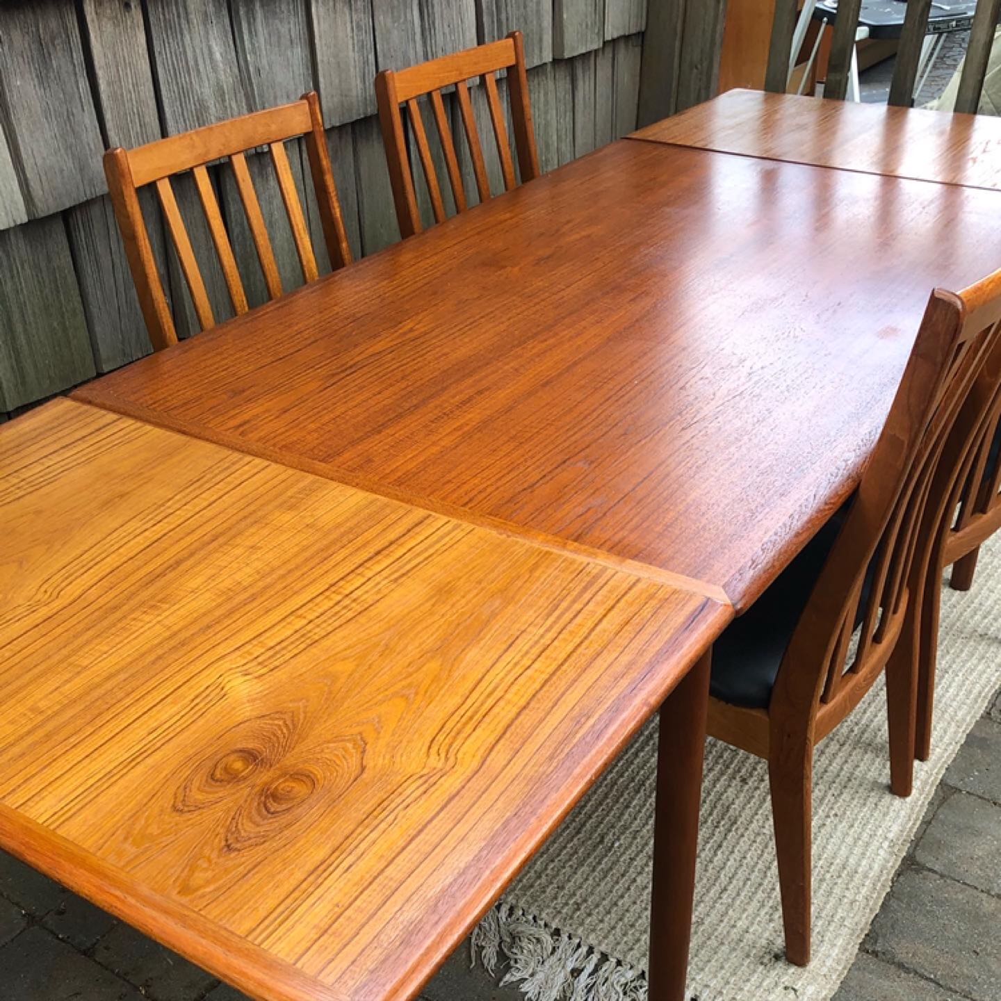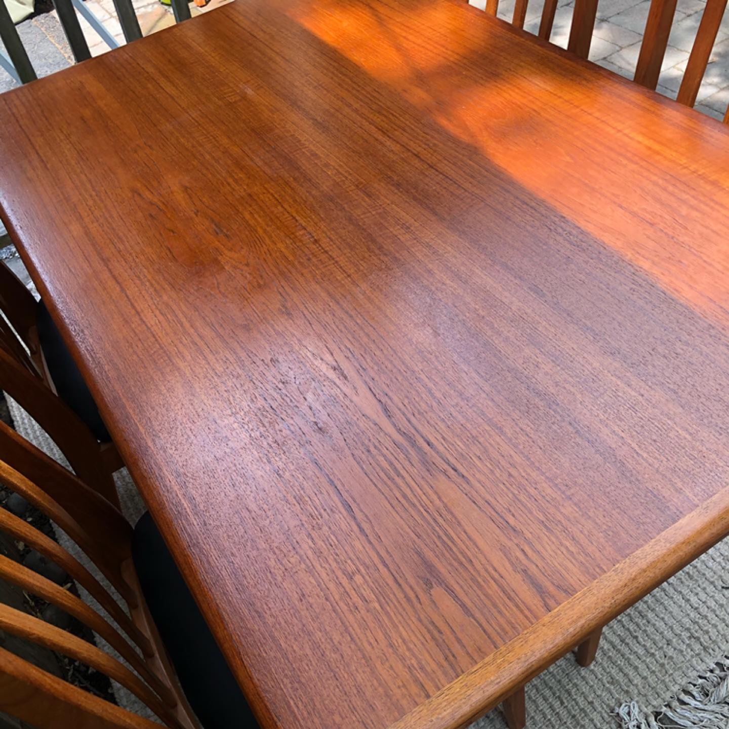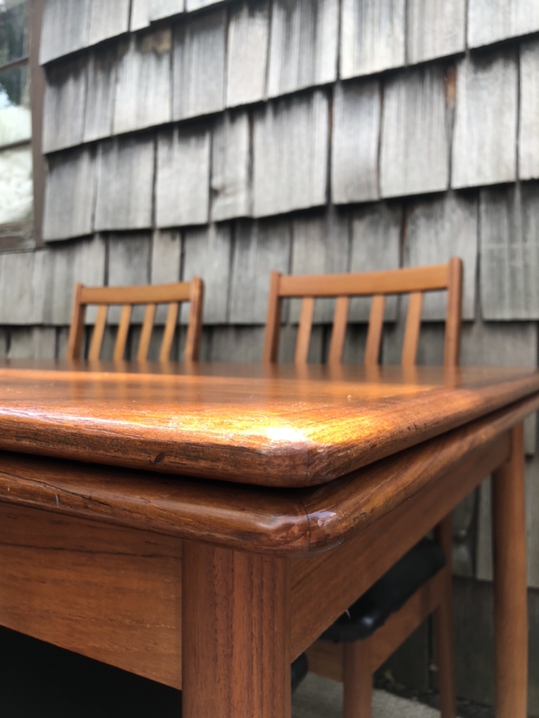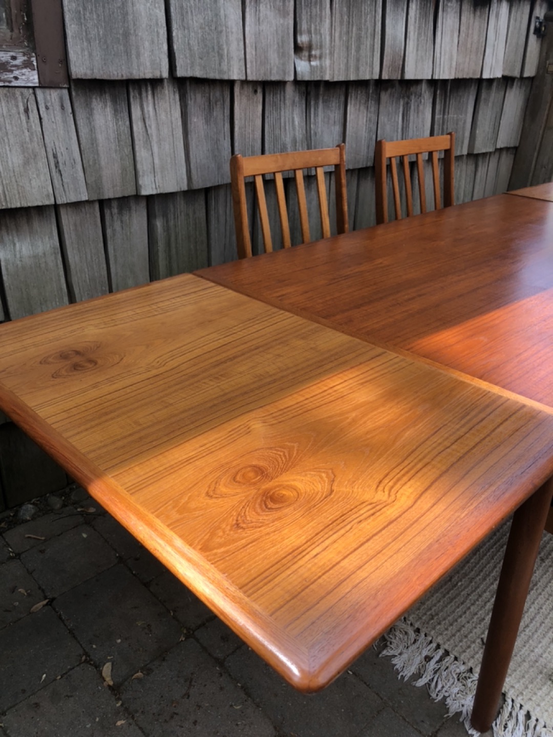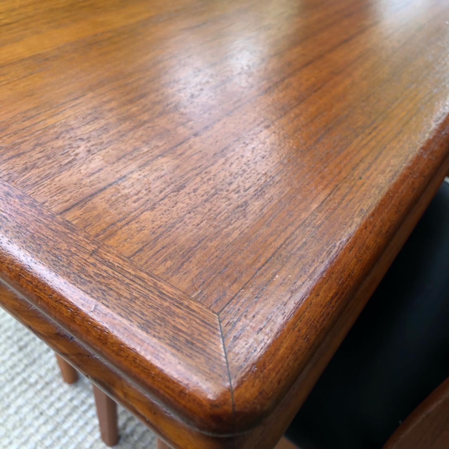 Teak Dining set $900 (if both parts bought together) Chairs $400 (for set of 4) -average vintage wear -black vinyl chairs -Nordic furniture -good size and sturdy Table $550 - 55” L+ (2 leaves) 21” + 21” 29” H 35.25” W -legs were refinished by us (like new) -the top has been refinished by previous owner with a stain similar to original colour and polyurethane (poly does not have a perfect application) however because a poly finish is stronger than teak oil this table will be able to live durably for a long time (great with kids) - the top could easily be refinished In a couple of years to get rid of the poly finish -some spots where finish was sanded due to uneven application -the top of this table has one small dent but it’d highly unnoticeable - great vintage condition -super sturdy and solid -one leaf sits a little higher than the other but it could just be something needing adjustment *set can be split apart Viewings are welcome, fastest pickup This table dissassembles easily into 4 legs, 2 separate leaves, base and top Follow us @teakhunters on Ig
