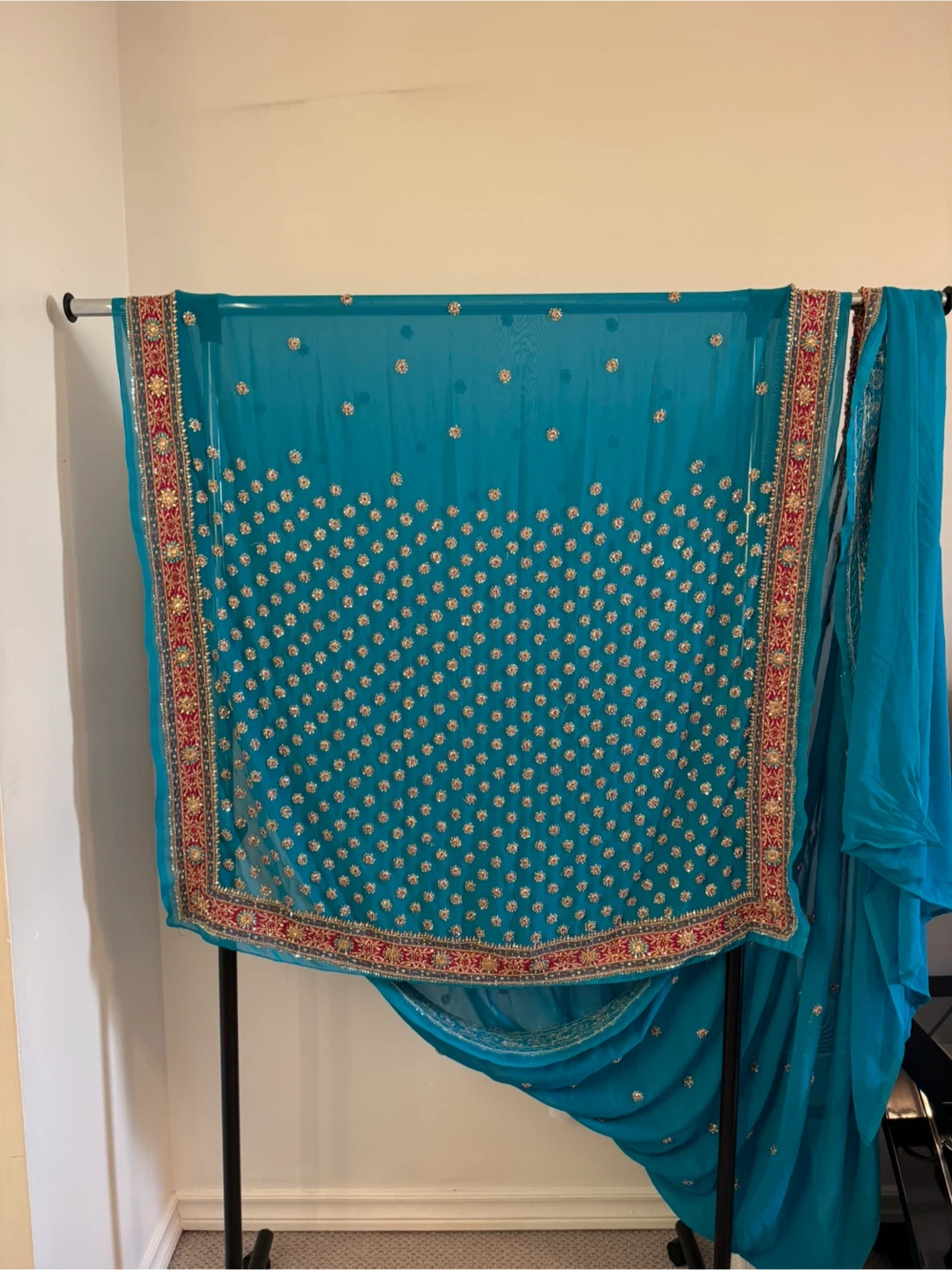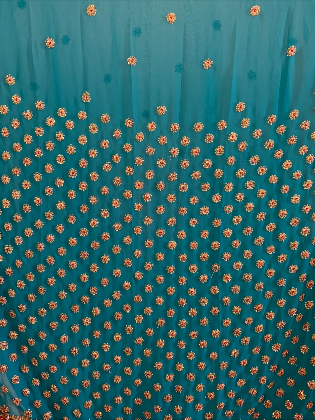 60Beautiful teal blue saree with intricate embellishments! It features a detailed border and delicate floral patterns throughout the fabric. Perfect for special occasions or adding a touch of elegance to your wardrobe