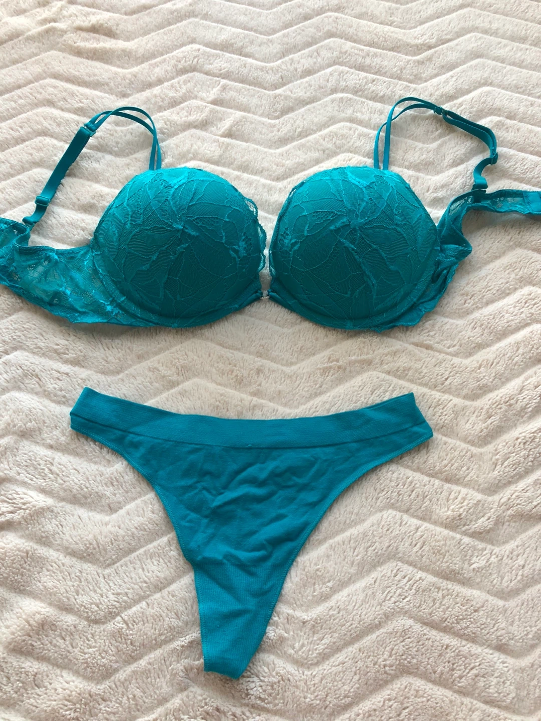 408Selling a teal lingerie set. The bra has a lovely lace detail. Perfect for adding a pop of colour to your collection!