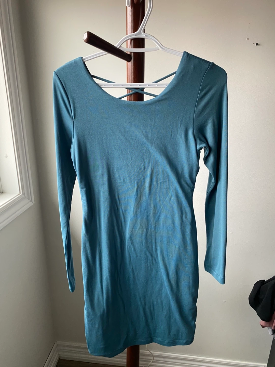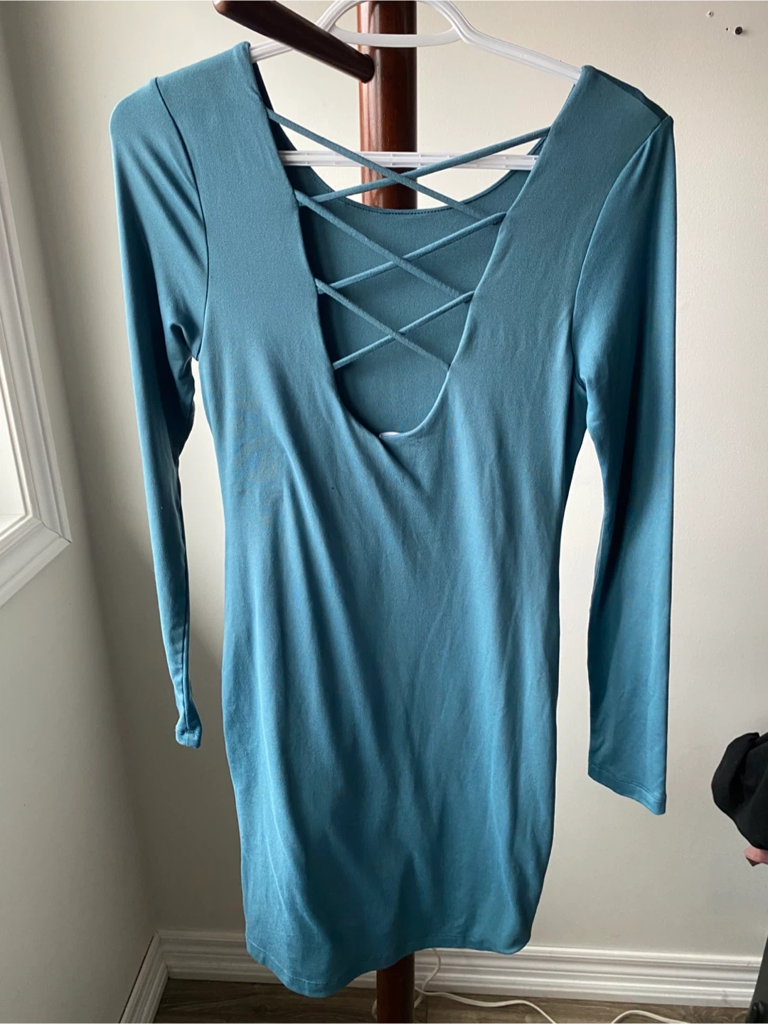 74Long sleeved teal party dress with open back and sitting above the knees.