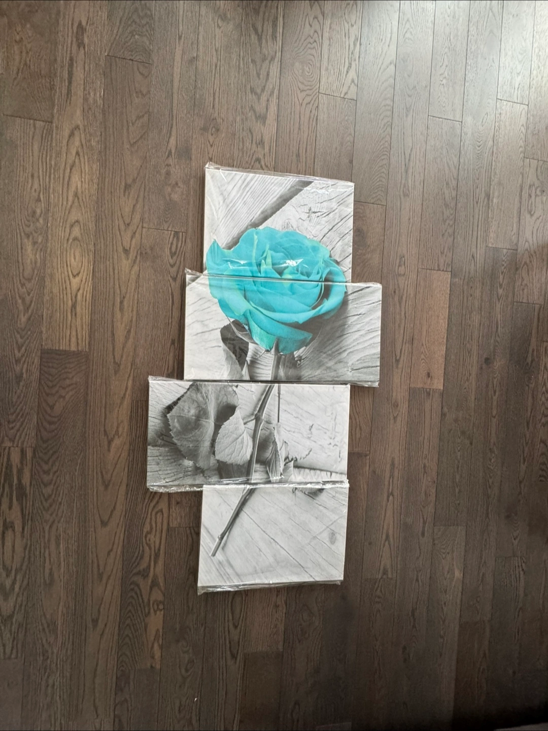 Brand new canvas wall art featuring a teal rose design. It comes in four pieces, ready to add a touch of elegance to your home decor. The black and white background with the pop of teal makes it a unique piece
