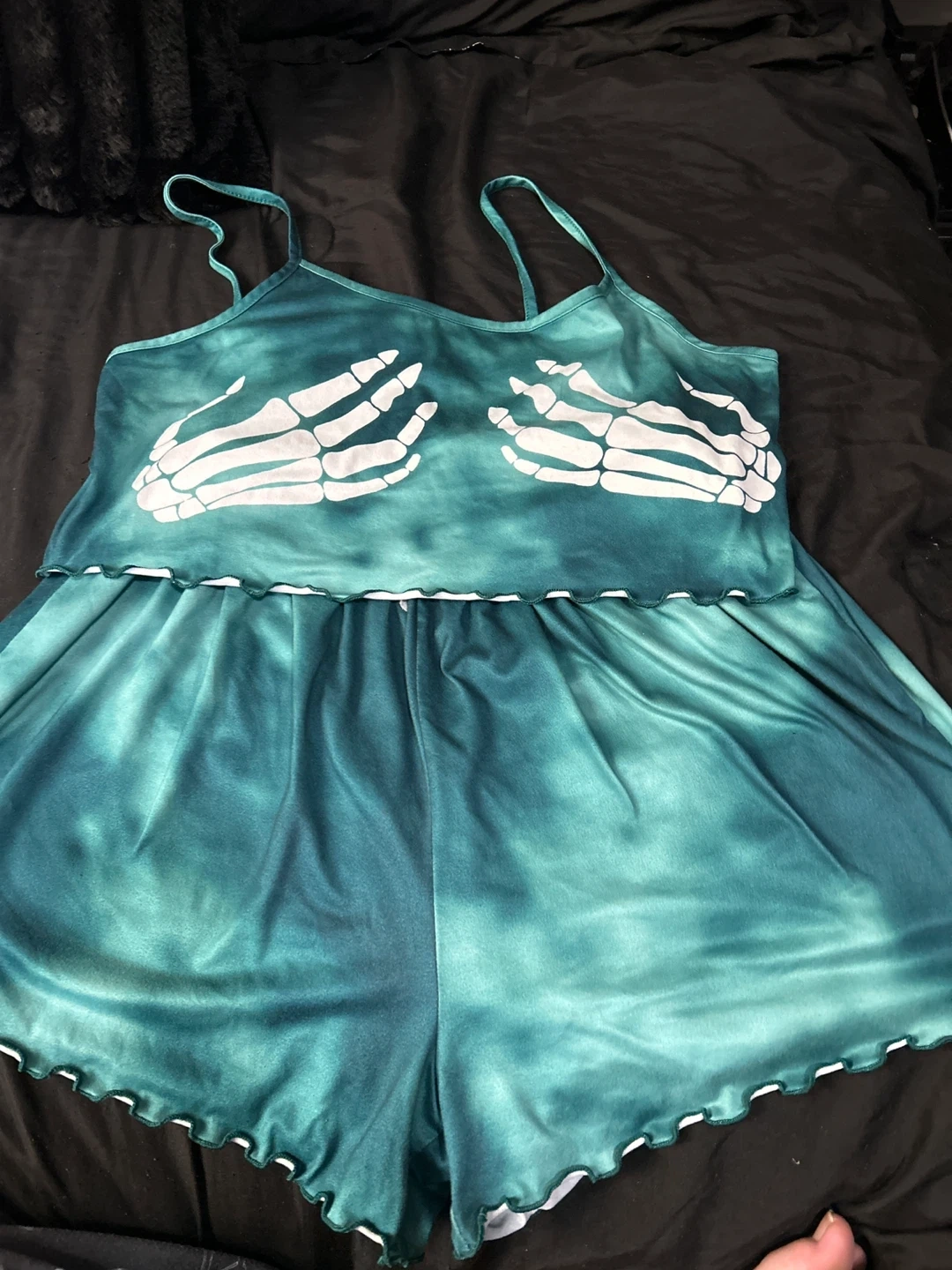 76Selling a cute teal pajama set with a skeleton design! It's a size 1XL and in great condition. Perfect for a comfy night's sleep or lounging around the house