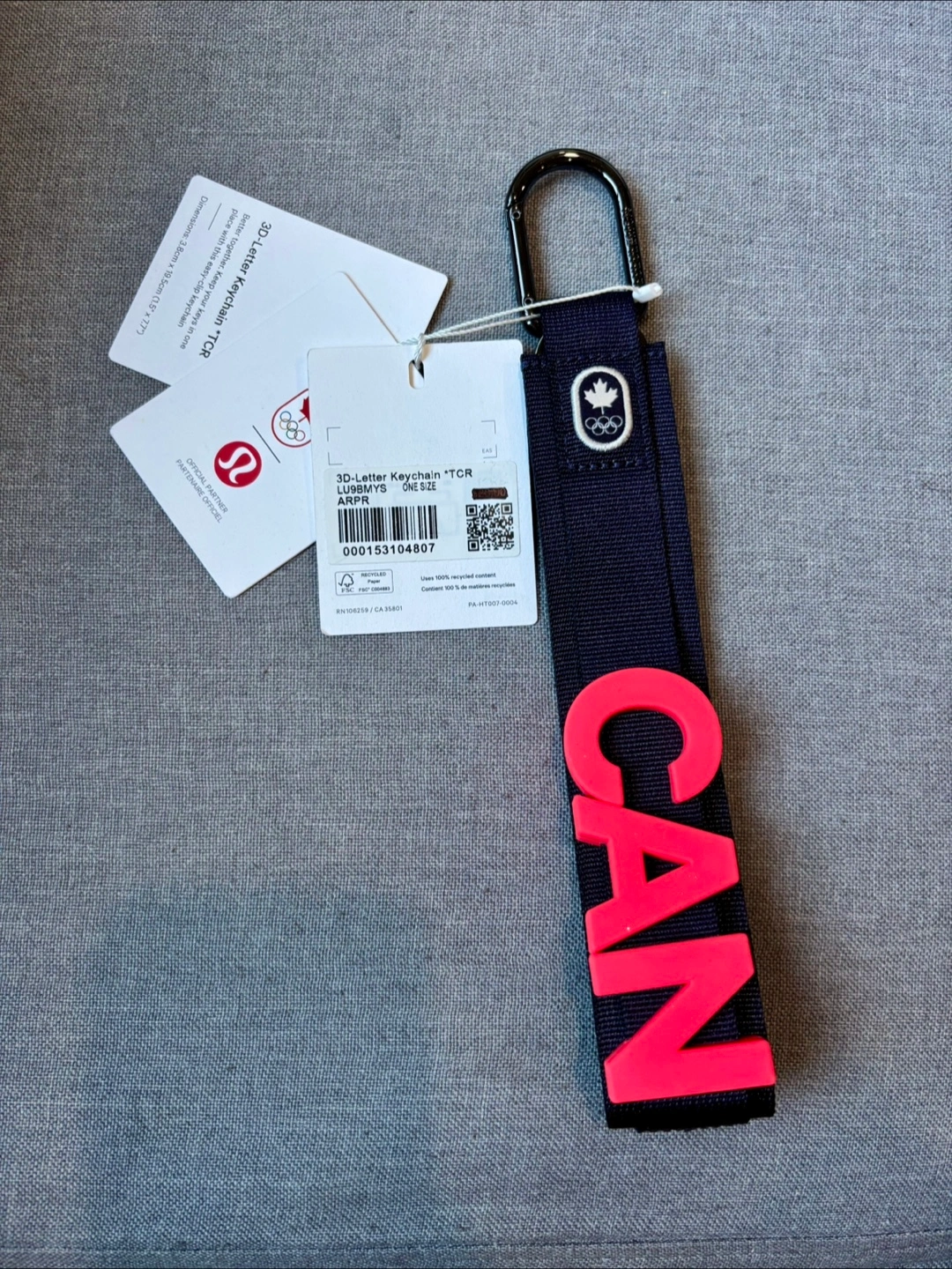 Lululemon Team Canada keychain. Features 3D lettering. Black fabric with red lettering. COC logo. Unisex.