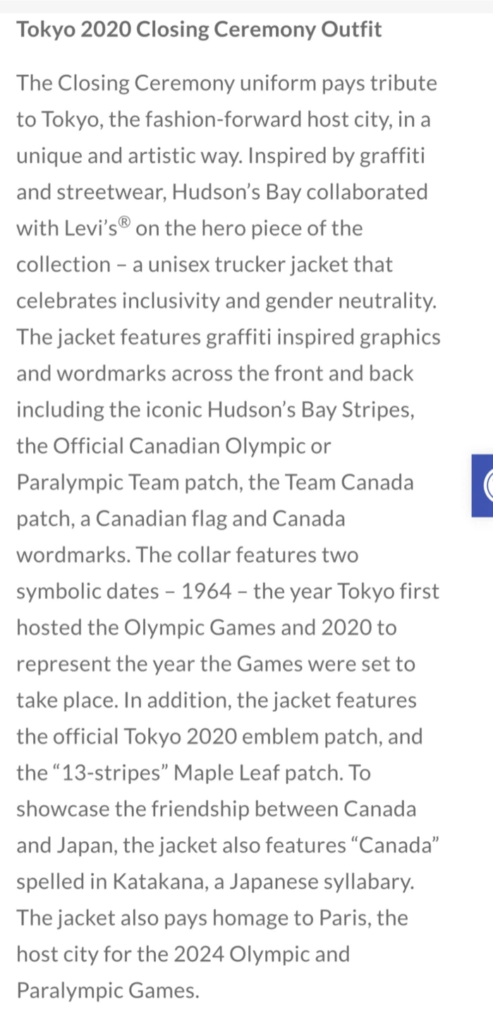 43Canadian Women's Closing Ceremony Levi's Jean Jacket (2020 Olympics) OFFICIAL HUDON'S BAY EXCLUSIVE CANADIAN OLYMPIC TEAM COLLECTION Jacket is Medium (unisex - women or men) Measurements: Armpit to Armpit: 20" Sleeve Length (tip of shoulder to end of cuff): 25 1/2" Length of coat (collar to bottom of coat): 25" * See last image for details on this design. Cash & pick up only near Leslie/ Sheppard.