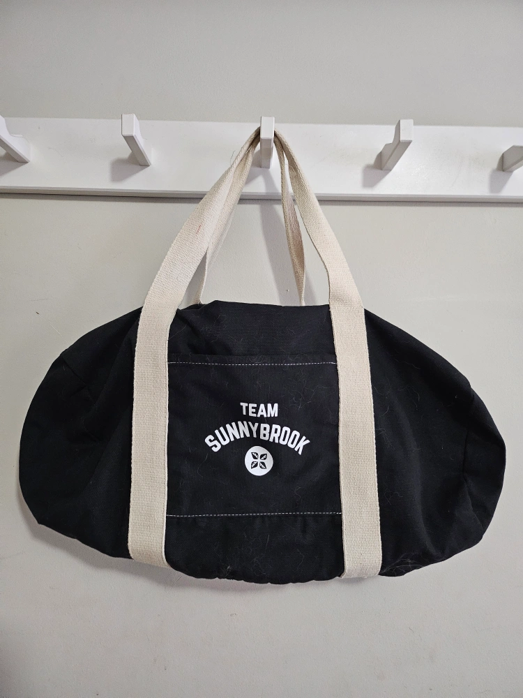 1000+Black canvas duffle bag. Cream-coloured straps. Team Sunnybrook logo. Good used condition.