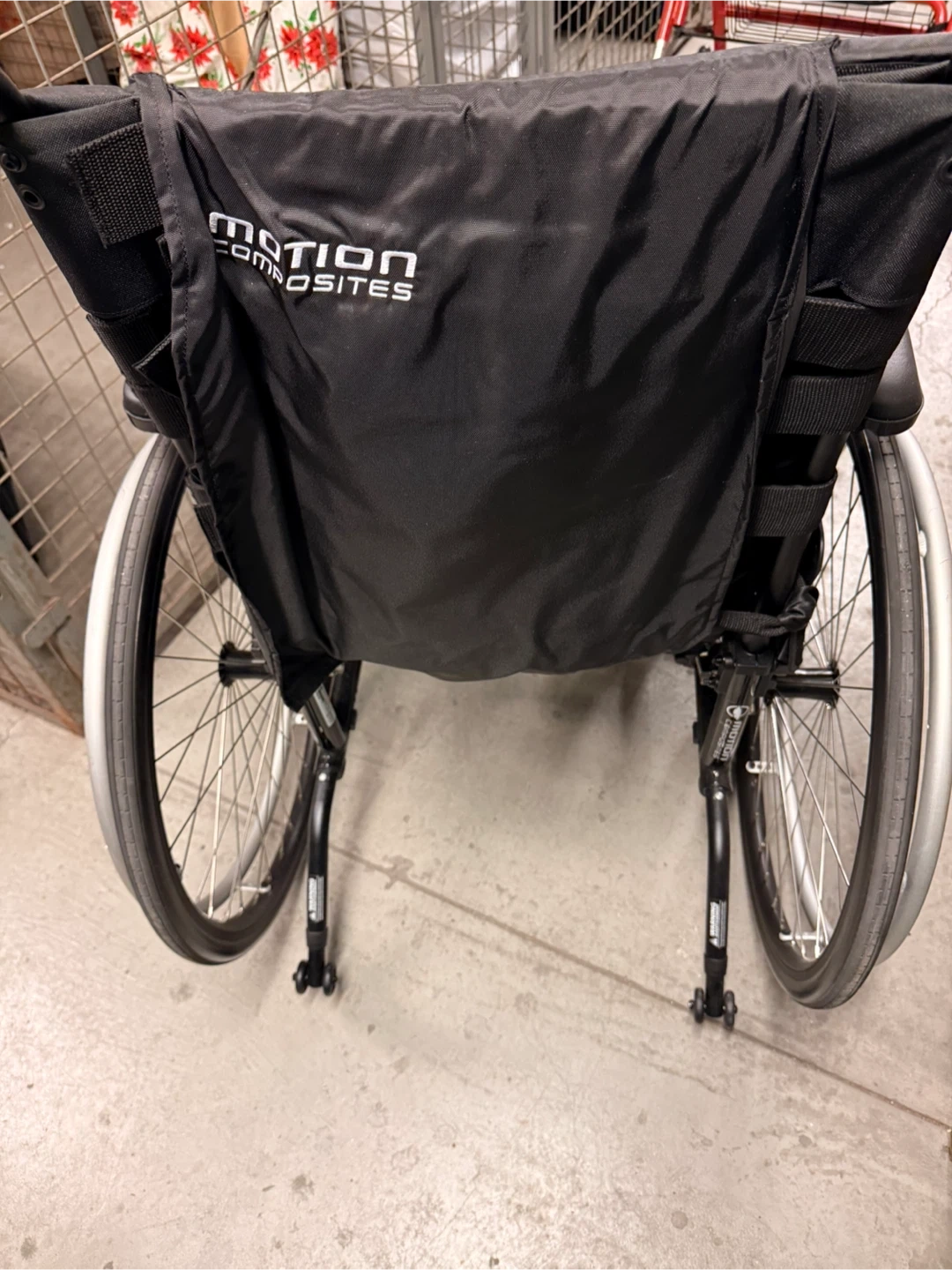This is a black wheelchair from Motion Composites. It's designed for mobility assistance. The frame is black with silver spoked wheels.
