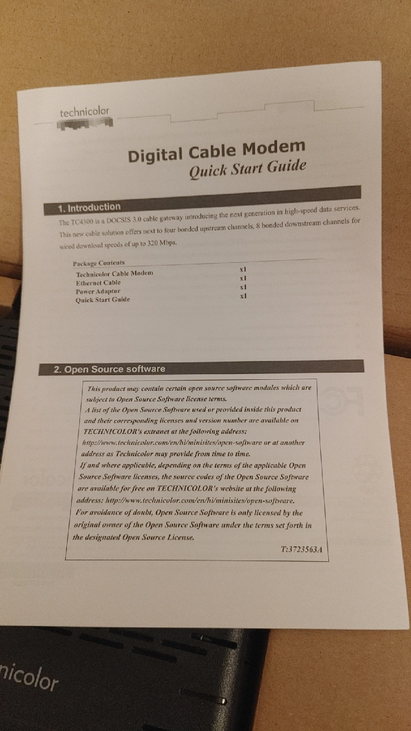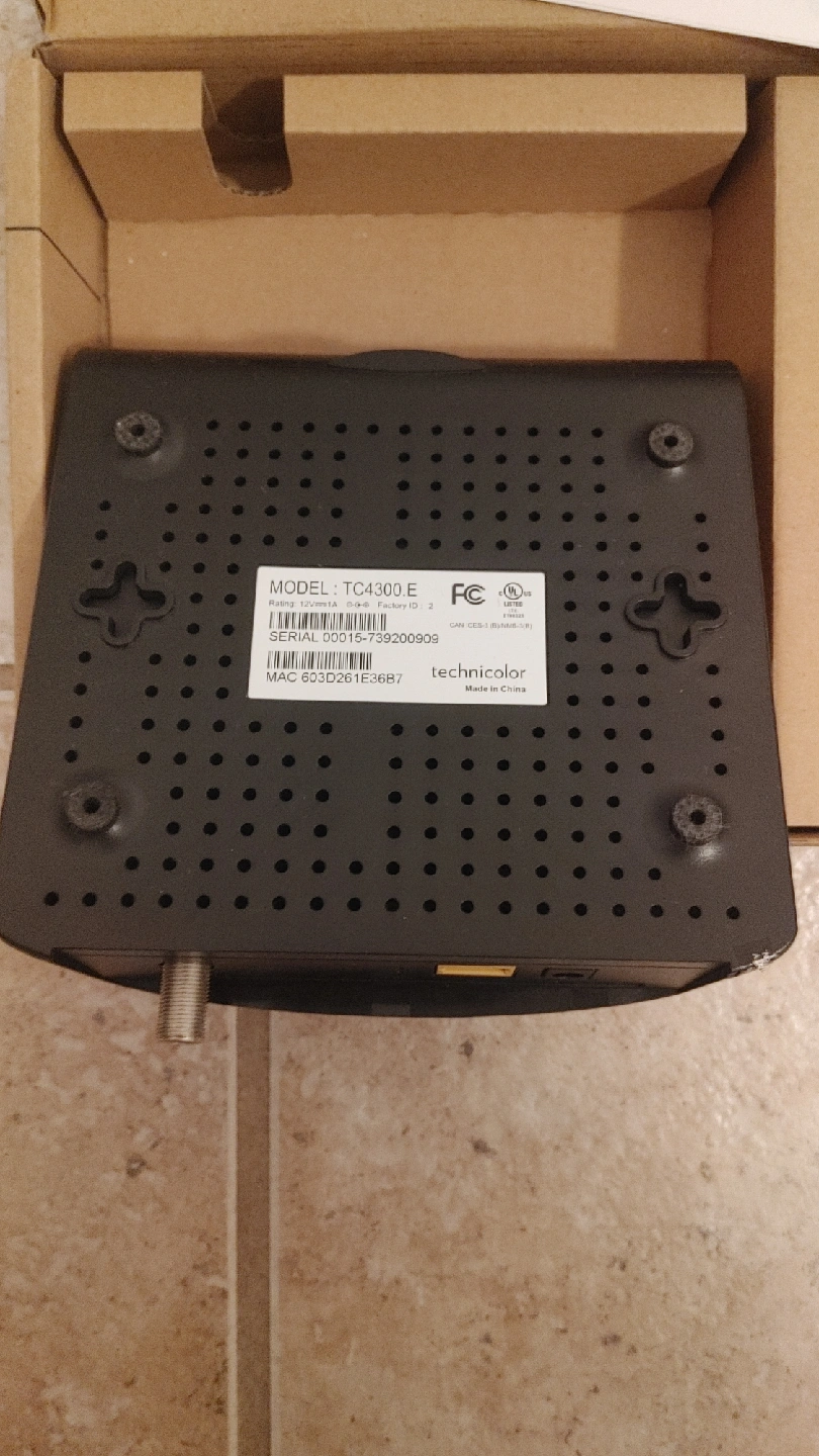 63Selling a Technicolor TC4300E digital cable modem. It's new and comes with the original box, Ethernet cable, and power adapter. The TC4300 is a DOCSIS 3.0 cable gateway, introducing the next generation in high-speed data services. This cable solution offers up to four bonded upstream channels and eight bonded downstream channels for wired download speeds of up to 320 Mbps