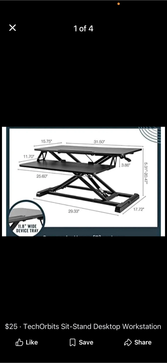 25Selling a TechOrbits sit-stand desktop workstation. It's a great way to switch between sitting and standing while you work! Key dimensions: - 15.75" and 31.50" wide - 11.70" and 25.60" deep - Height adjustable from 5.31" to 20.47" - Features an 11.8" wide device tray