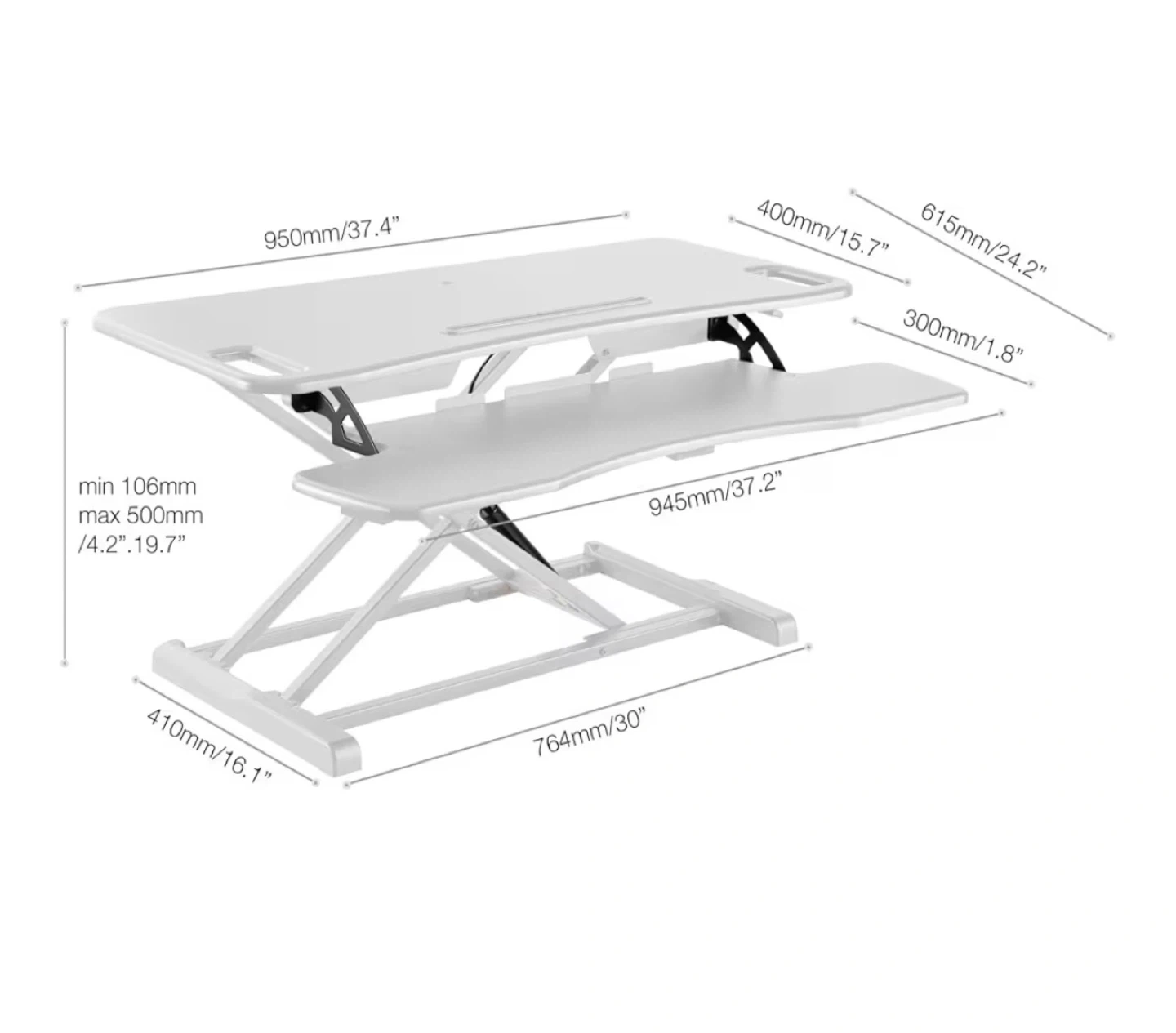 10Looking to sell my TechOrbits standing desk converter. It's a great way to switch between sitting and standing while working from home. The desk is white and features an adjustable sit-to-stand workstation with a keyboard tray. Dimensions: - 37.4" wide - 15.7" deep (upper surface) - 37.2" wide (keyboard tray) - Adjustable height from 4.2" to 19.7" Gently used, in good working condition. **heavy - 18.14lbs**