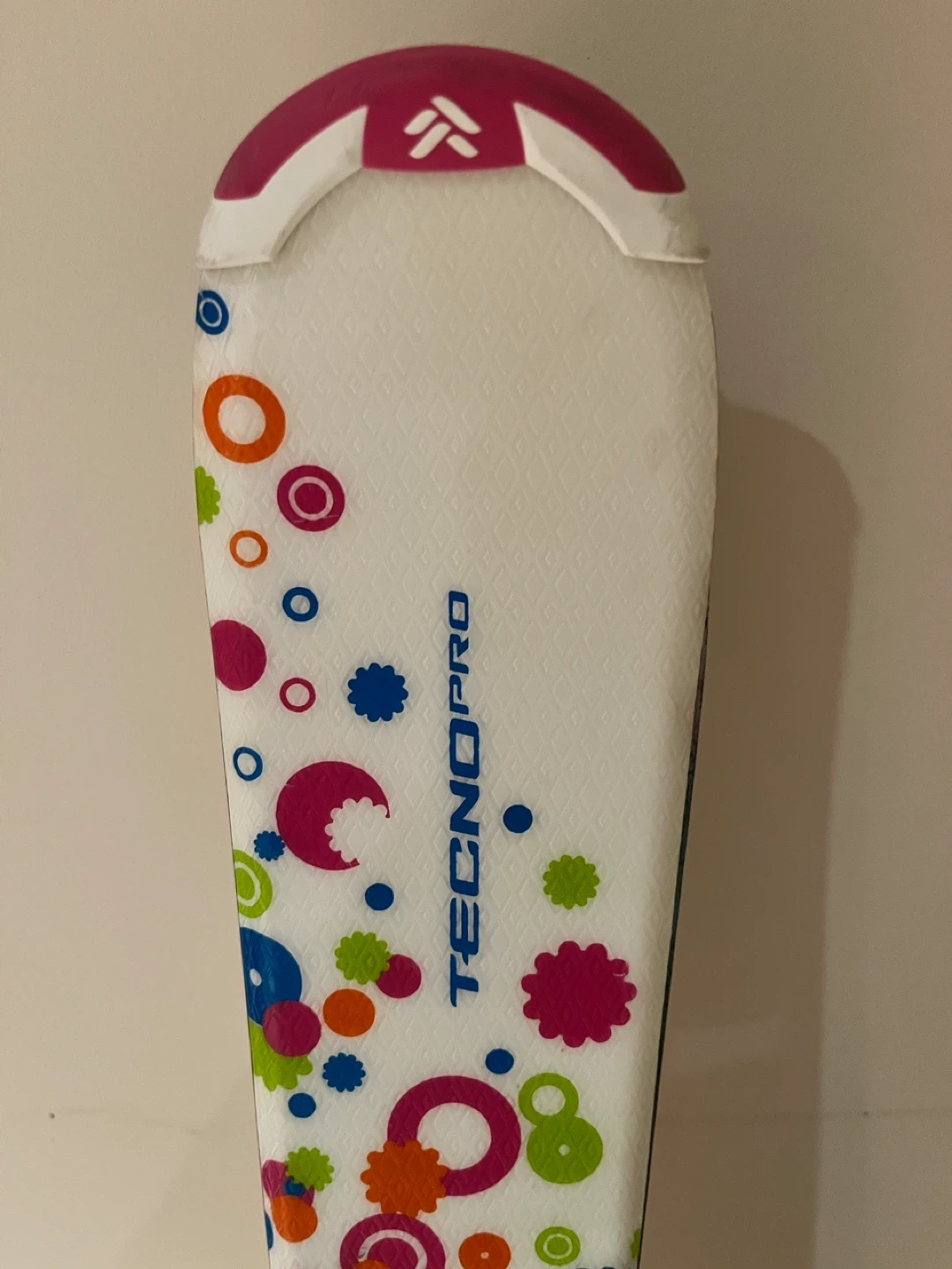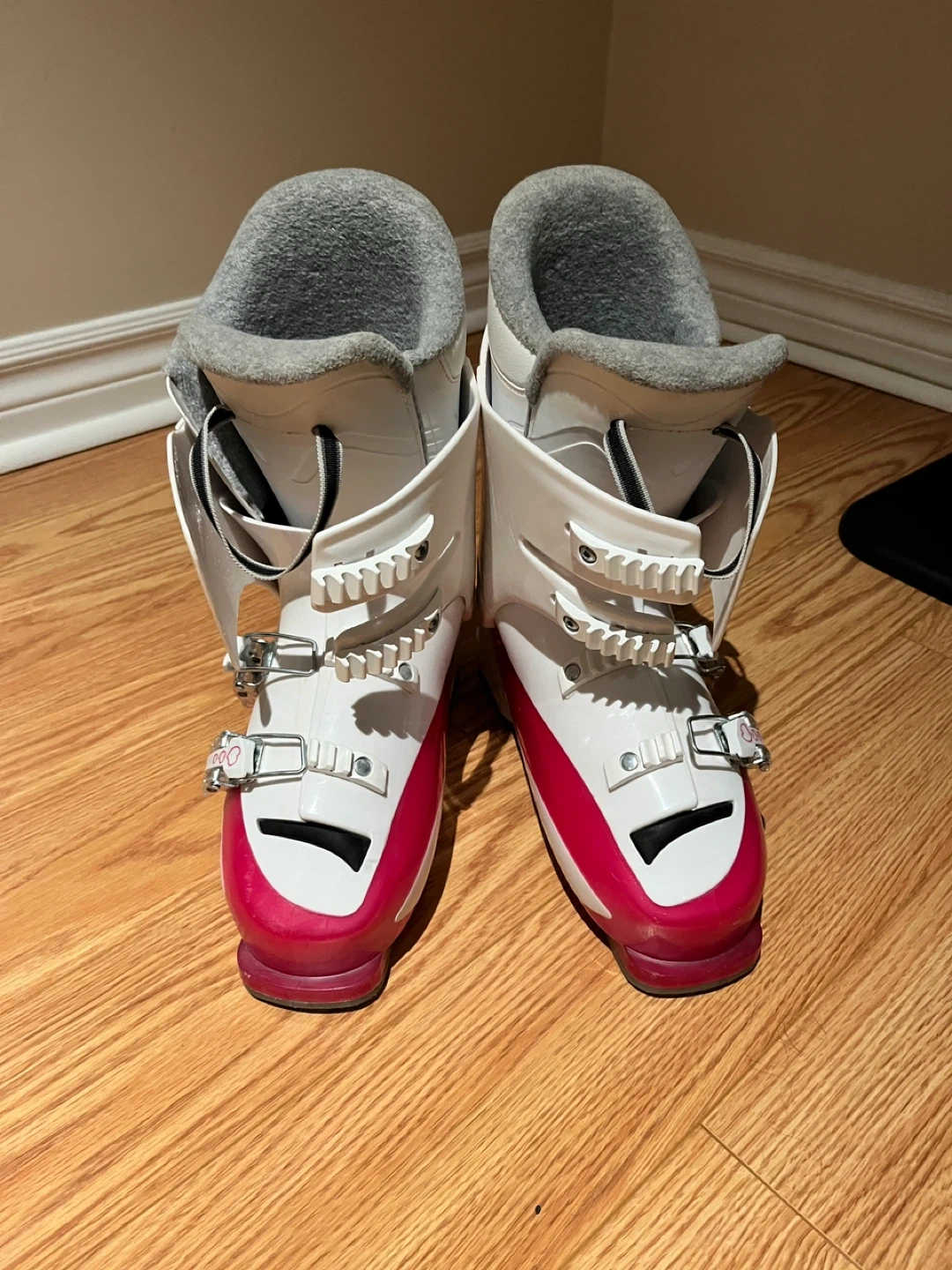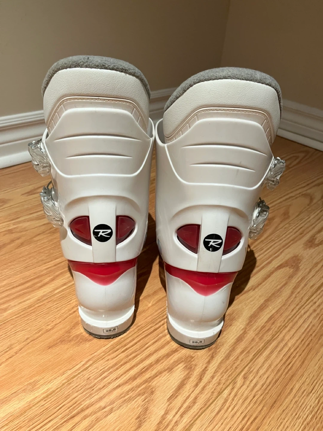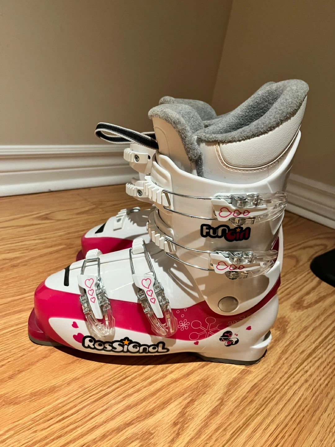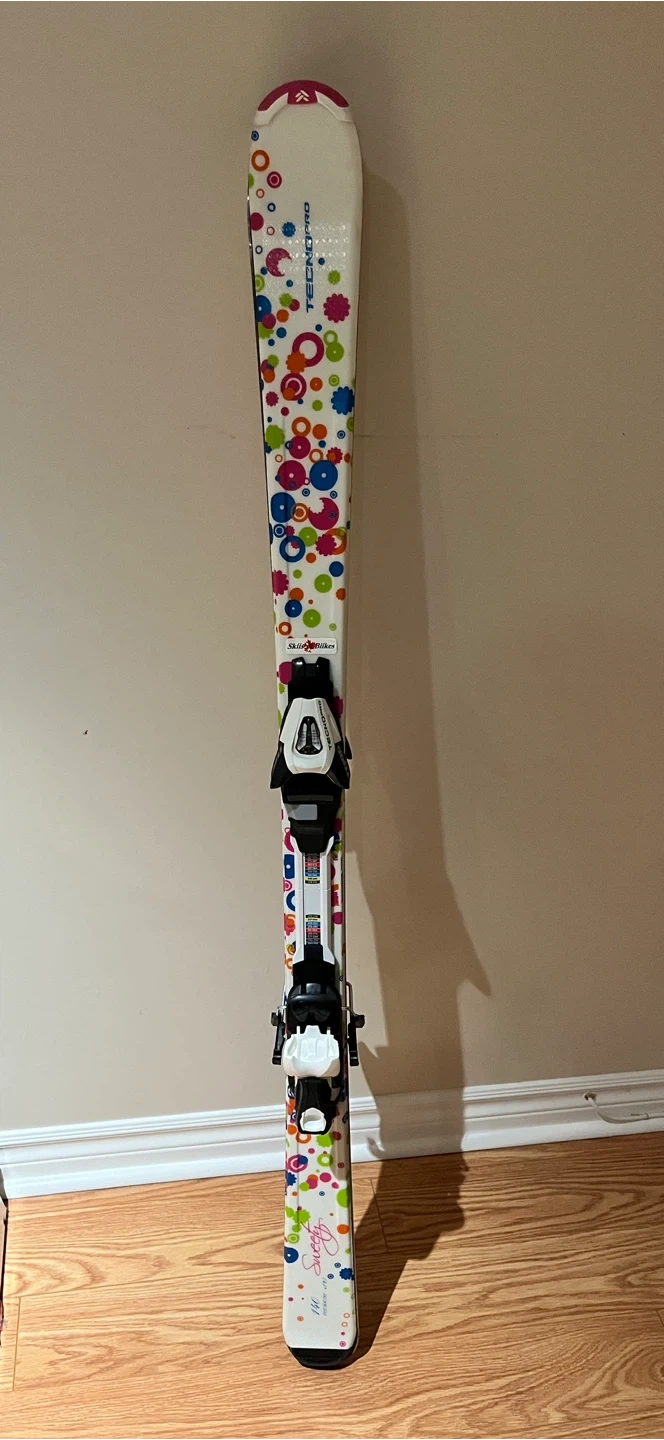 60Selling a pair of Tecno Pro skis along with Rossignol Fun Girl ski boots. The ski boots are white and pink and appear to be size 25.5.