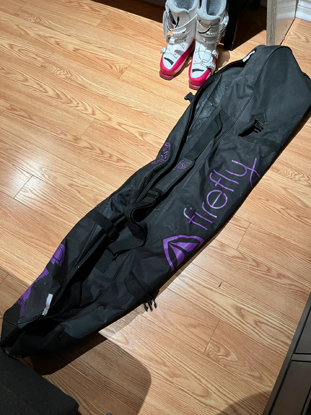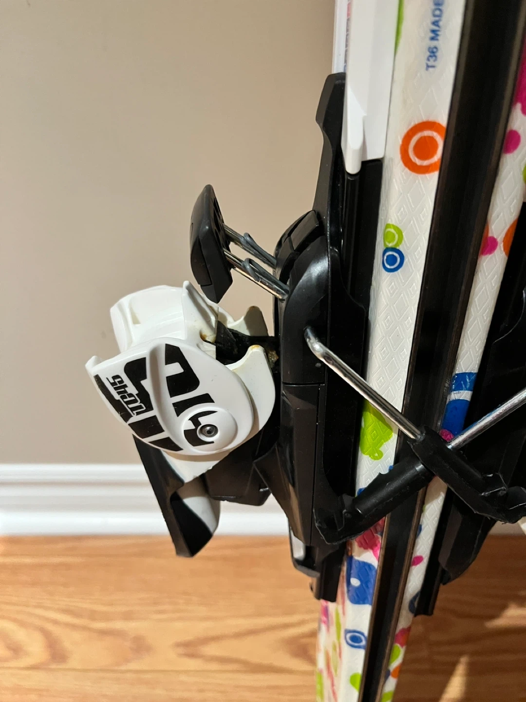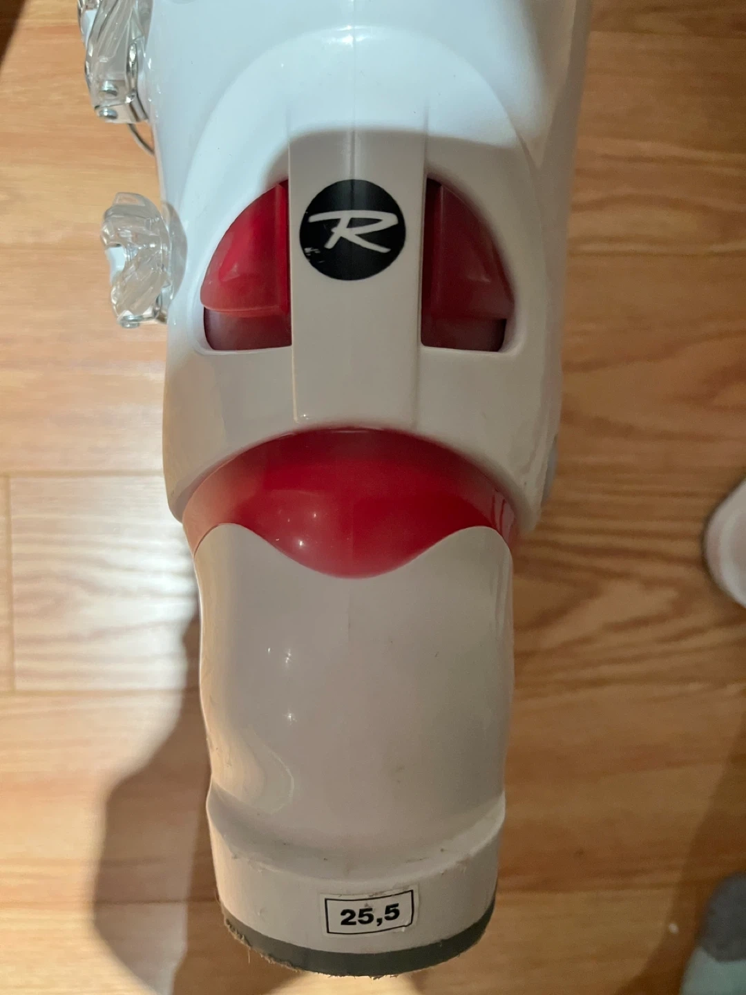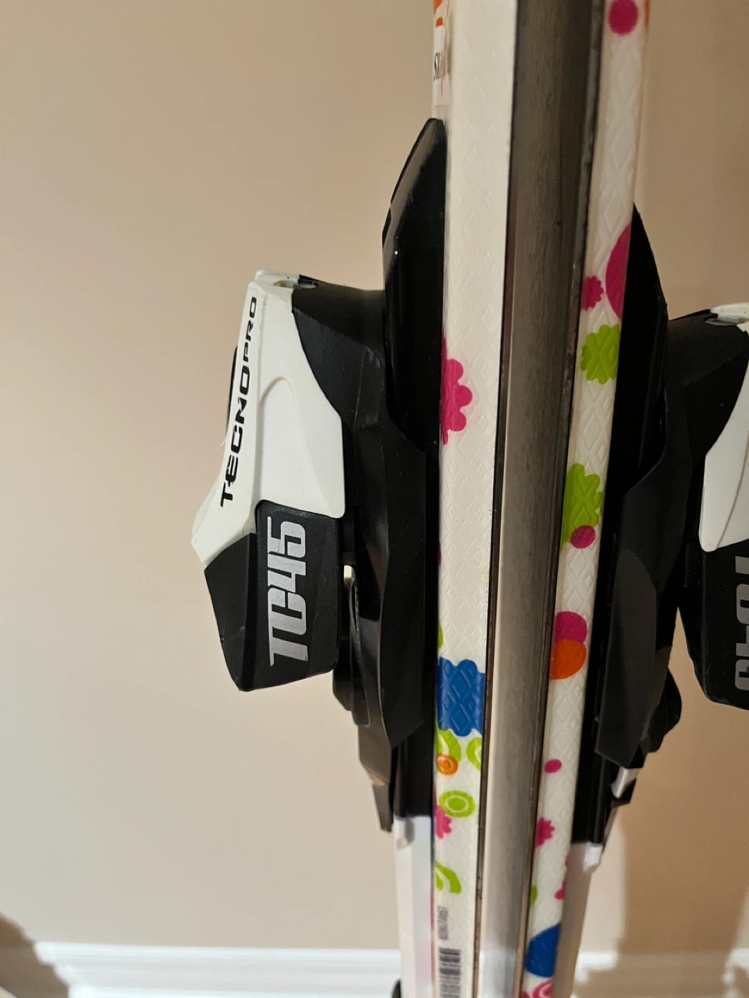 60Selling a pair of Tecno Pro skis along with Rossignol Fun Girl ski boots. The ski boots are white and pink and appear to be size 25.5.