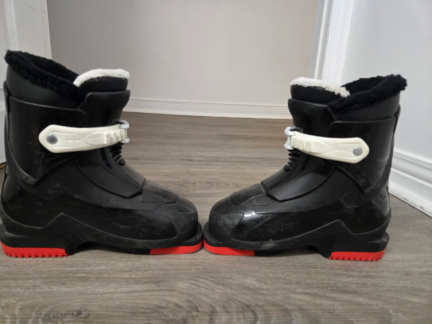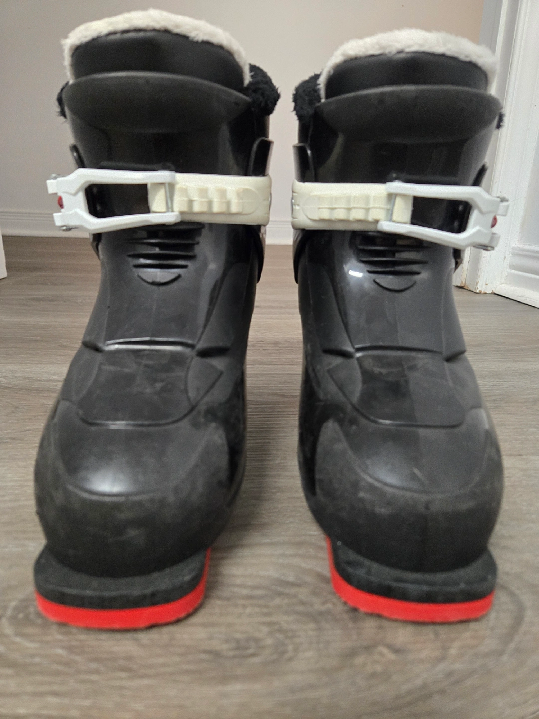 Selling a pair of Tecno Pro T40.1 ski boots. Slighty used. They're black with red soles and a white buckle. The size is 205, which is 247 mm.