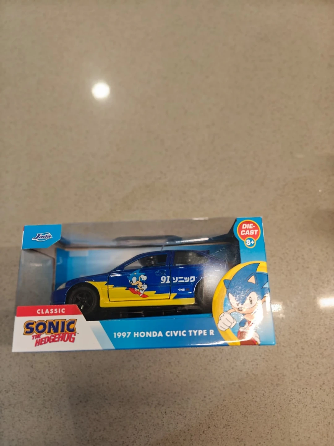 This is a Jada die-cast model of a 1997 Honda Civic Type R, styled with classic Sonic The Hedgehog graphics. It's recommended for ages 8 and up. The vehicle is made of die-cast metal. 20$ each
