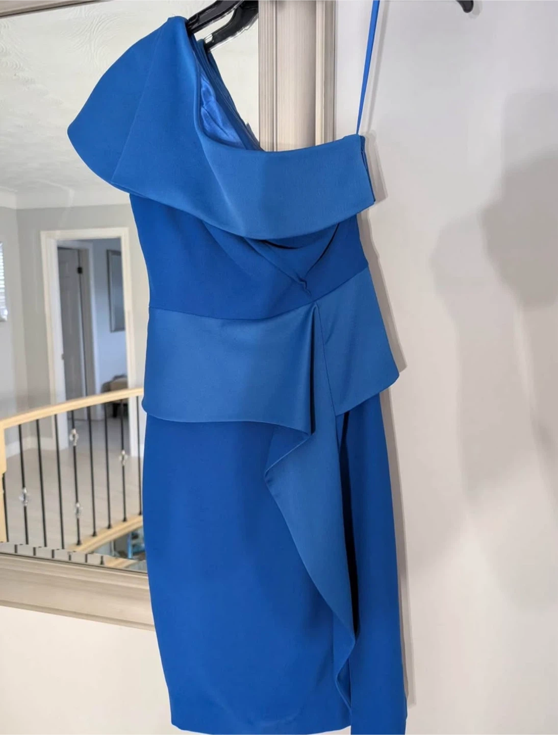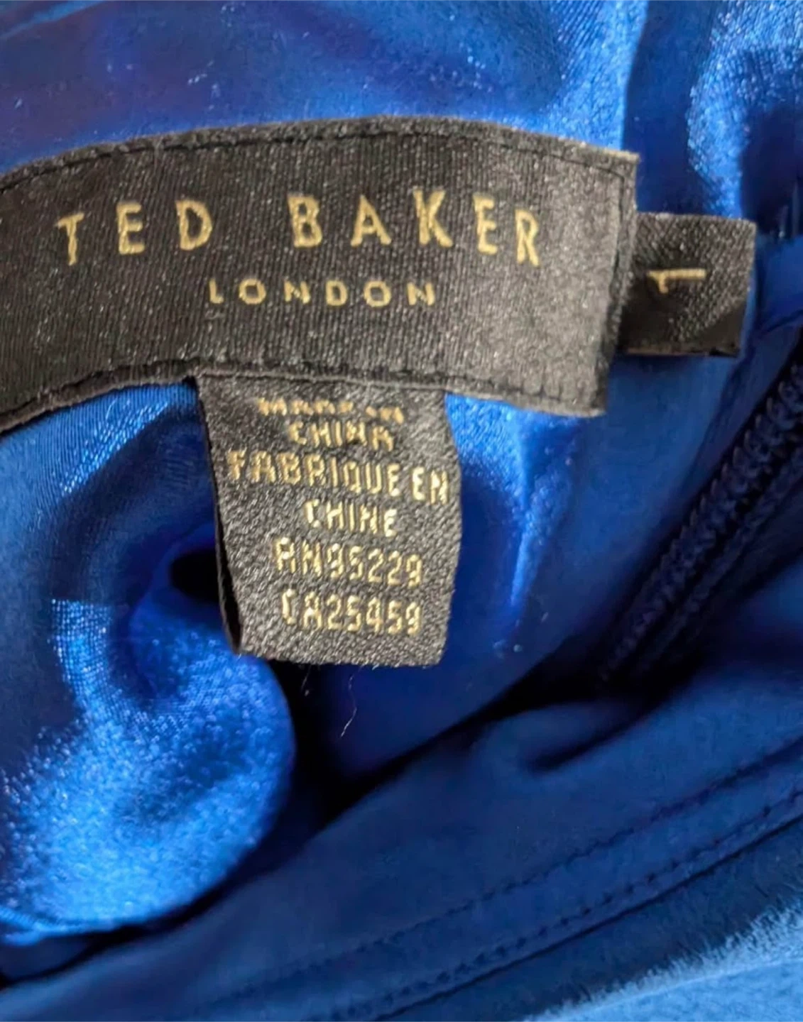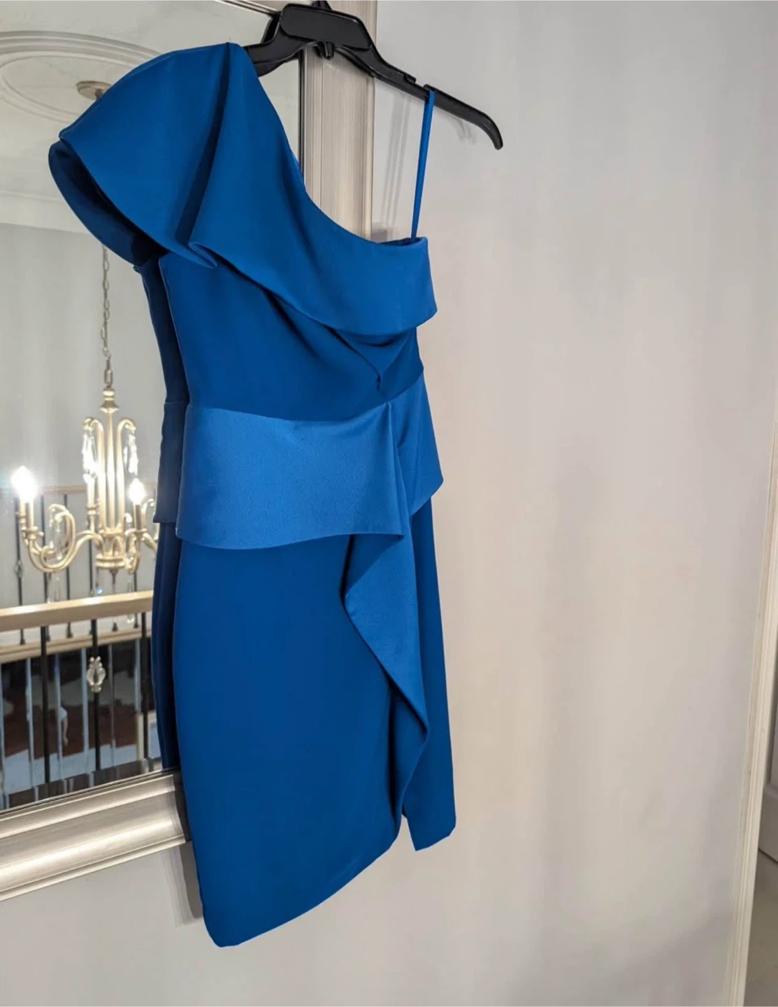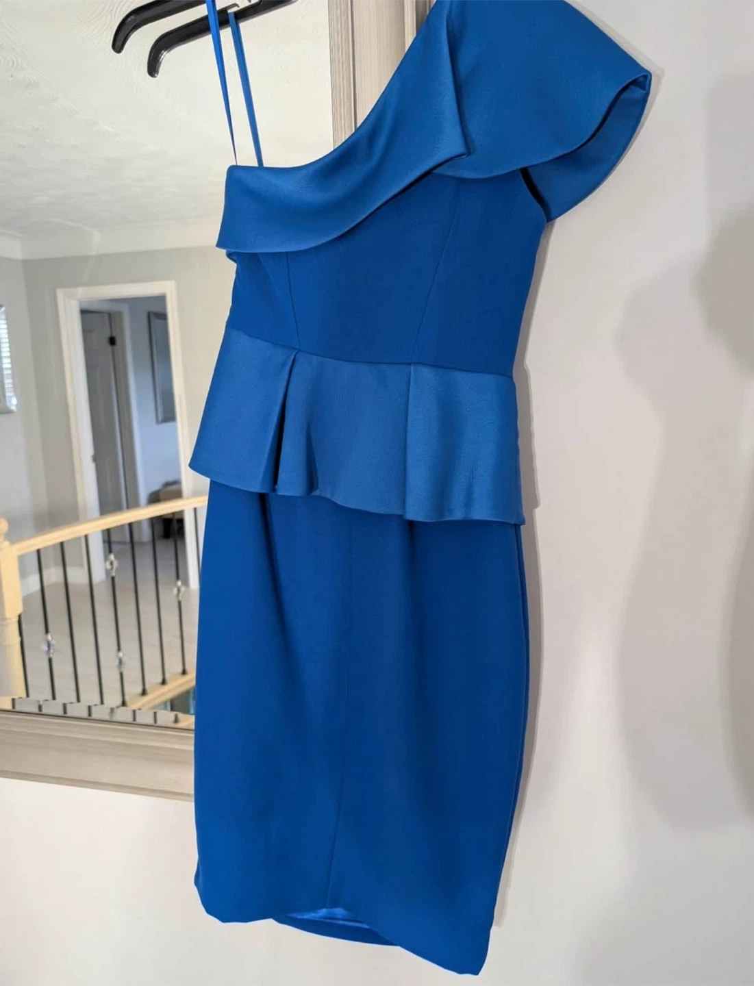 This is a Ted Baker dress in a beautiful blue colour! It features a stylish one-shoulder design. Perfect for a special occasion or a night out