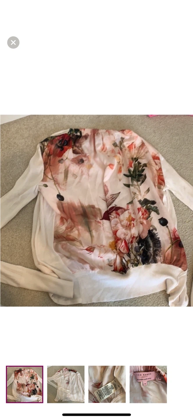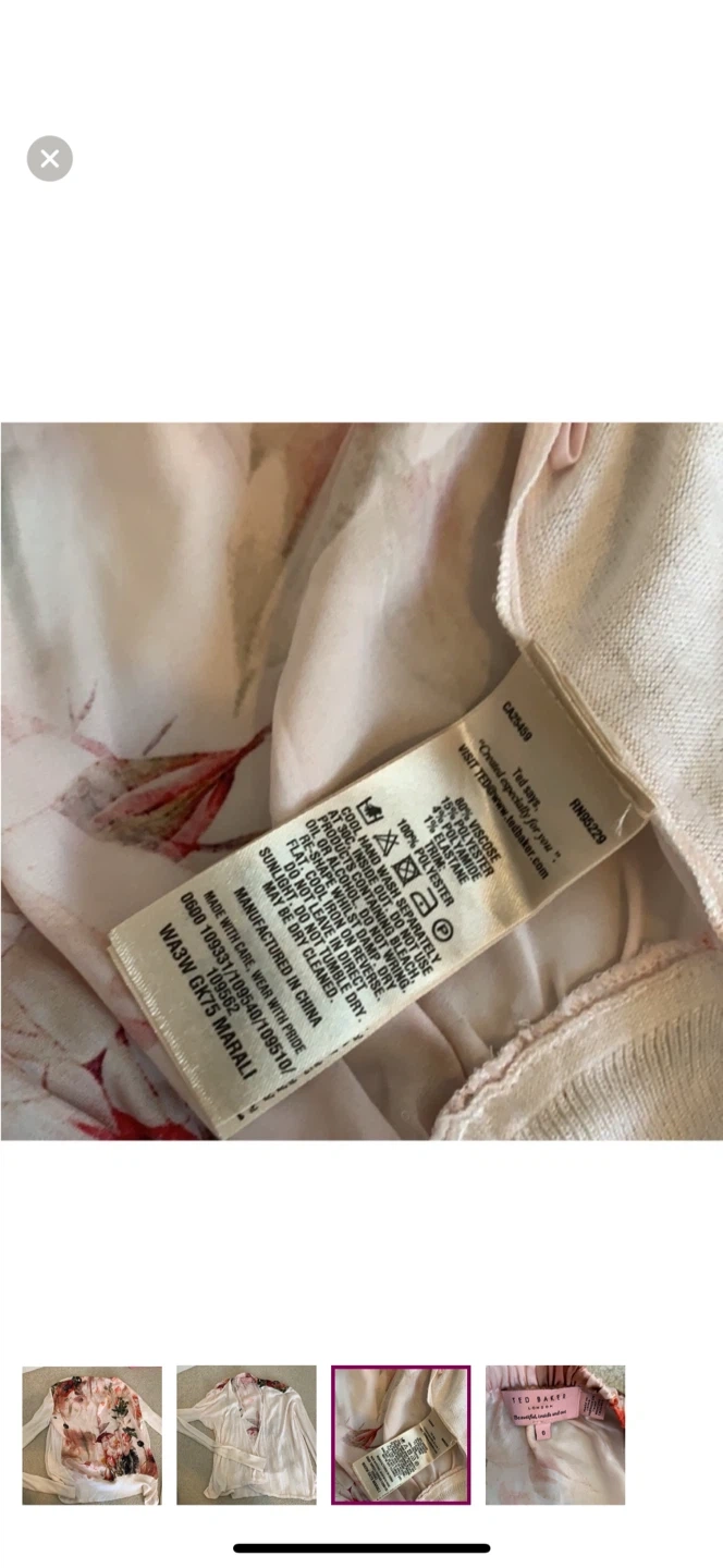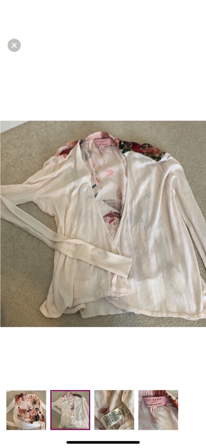 11Selling a Ted Baker cardigan with a beautiful floral pattern! It's a size 0 and made of 66% viscose, 28% nylon, and 6% elastane. The cardigan is in great condition and ready for a new home
