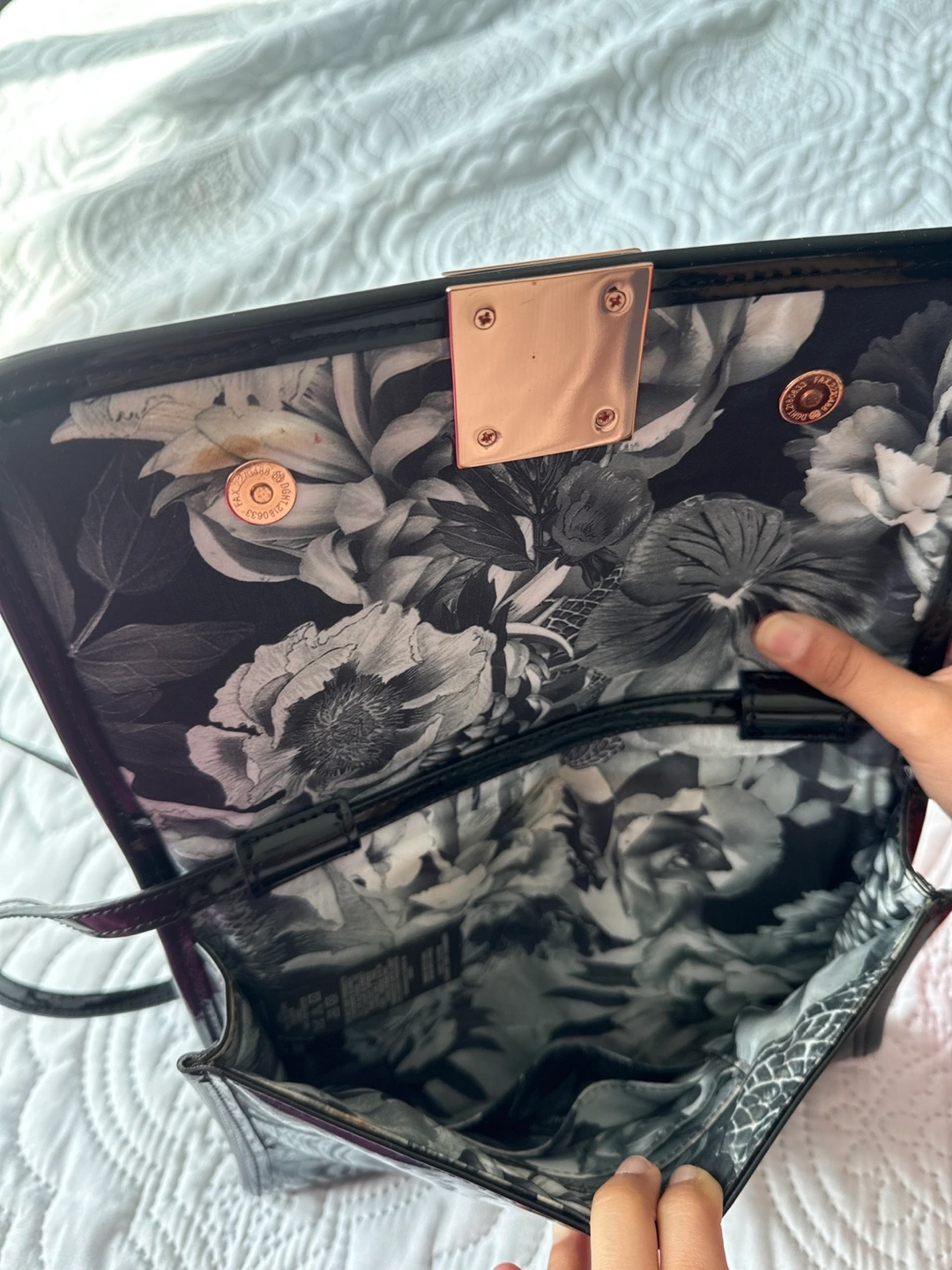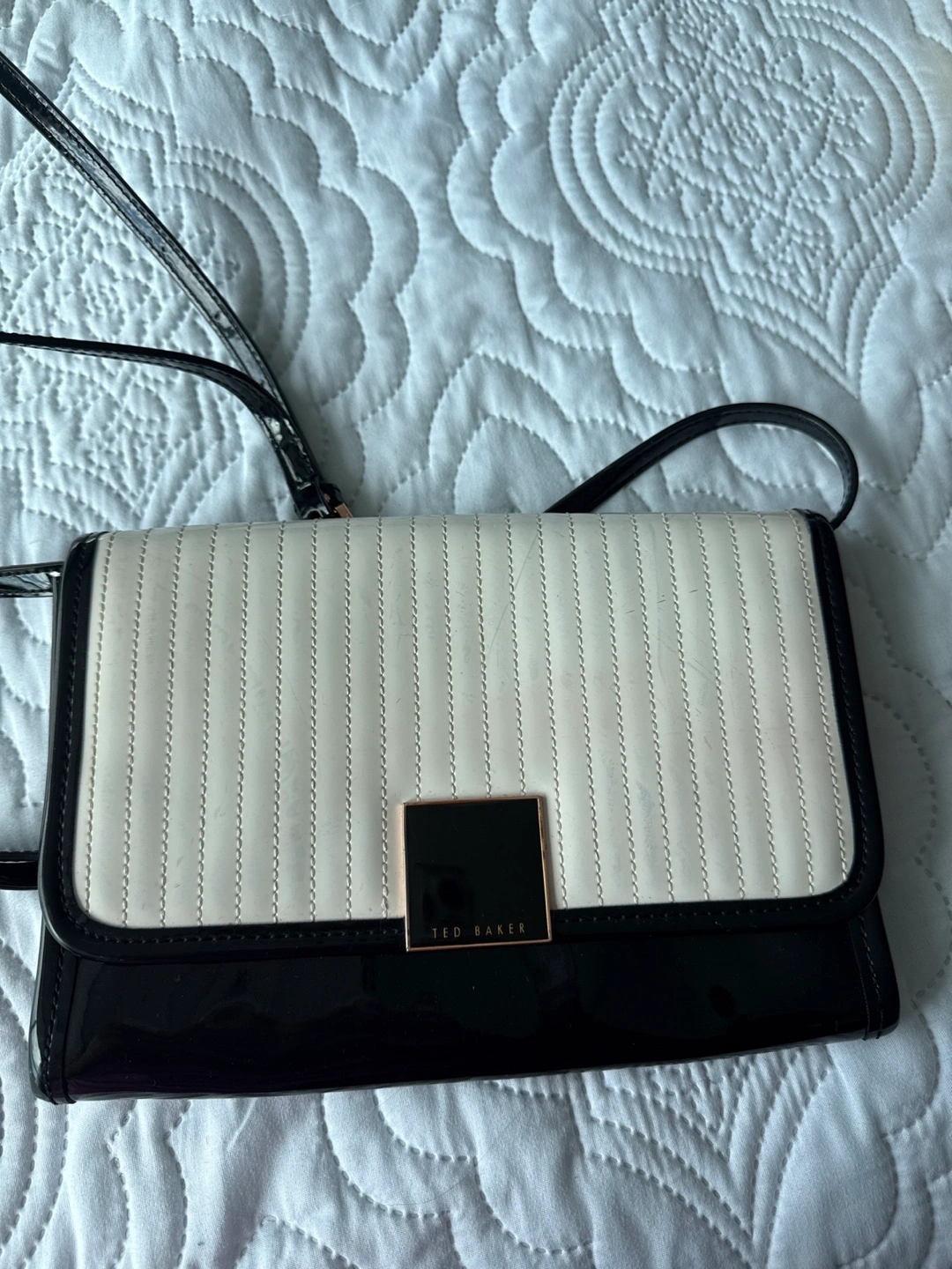 Selling a cute Ted Baker London crossbody bag in black and cream. It's a stylish accessory that's perfect for everyday use. The interior has a floral pattern. There are some signs of use, but overall it's in good condition!
