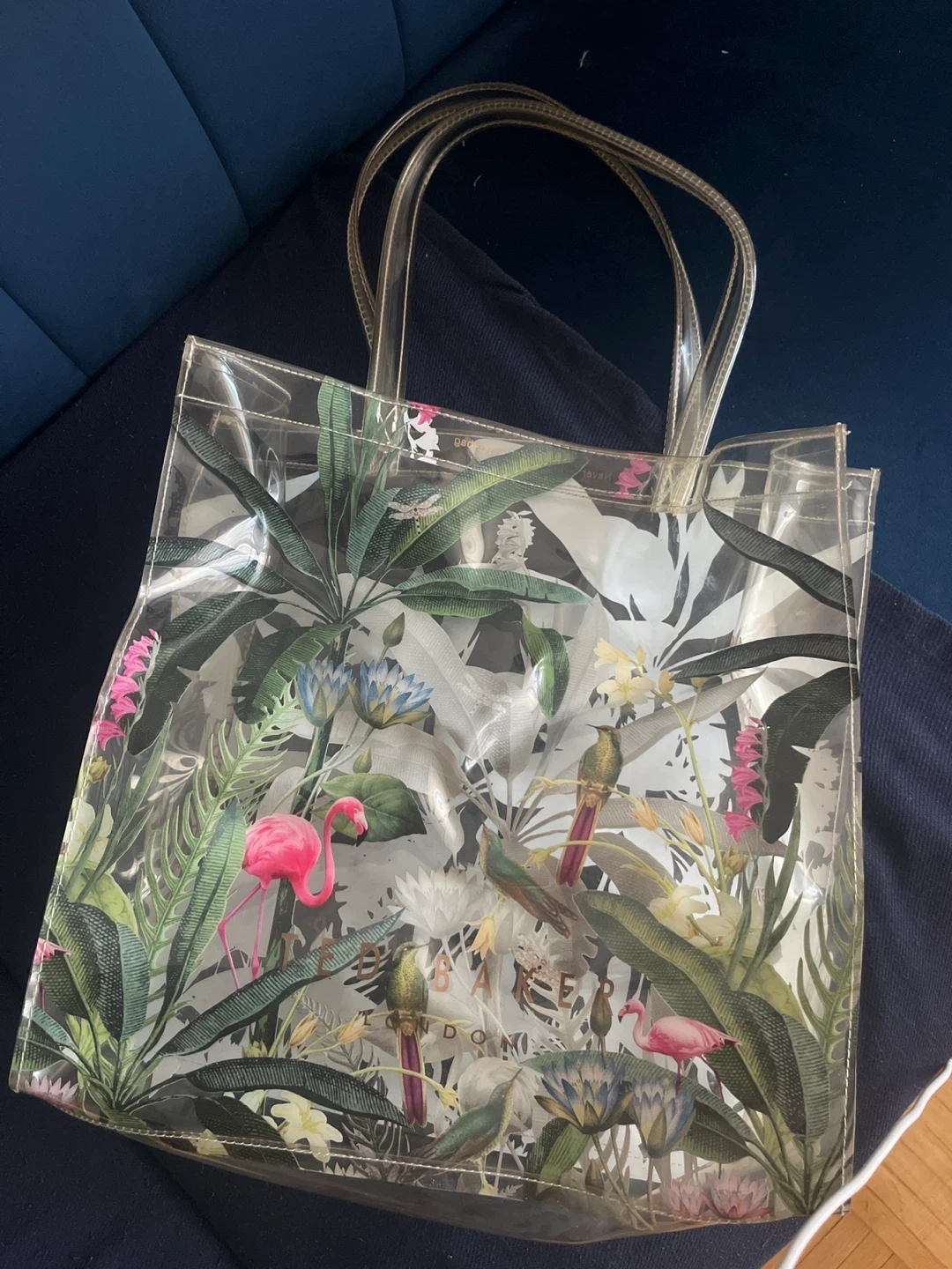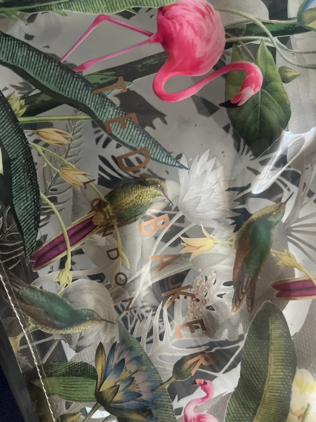 This clear tote bag from Ted Baker London features a vibrant floral and flamingo design. Perfect for carrying your essentials in style!